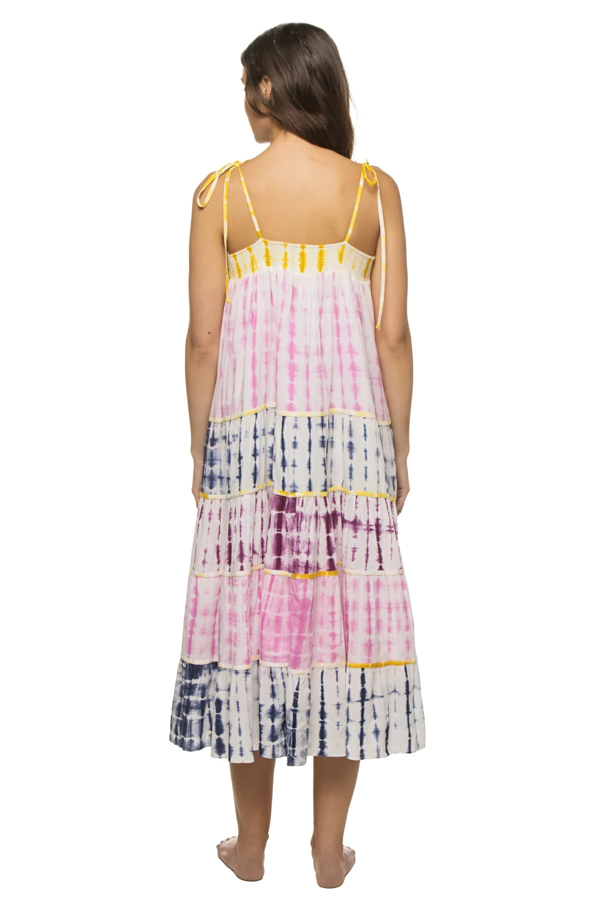 Holi midi dress features a multi colored tie dye print and offers a v-neckline and a tiered skirt with ties at waist.