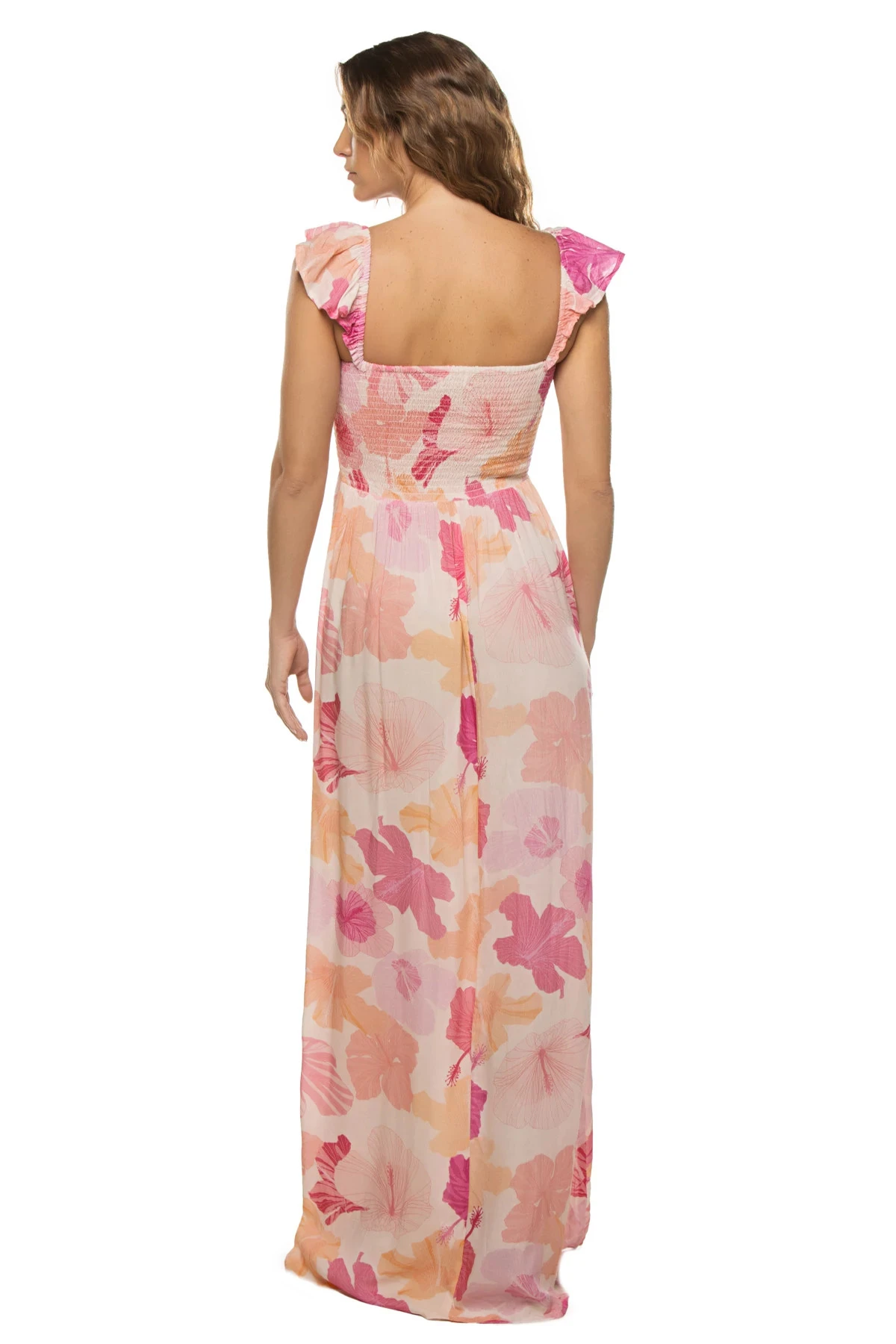 Hollie maxi dress features a floral print and a smocked cinch bodice with off shoulder ruffle sleeves.
