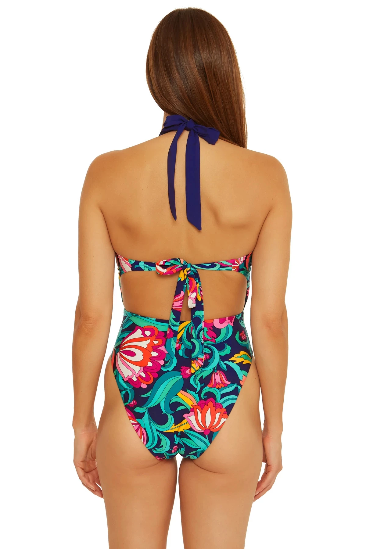 India Garden maillot one piece swimsuit features a front keyhole cutout and a scoop neck that offers adjustable halter ties and a back tie closure.