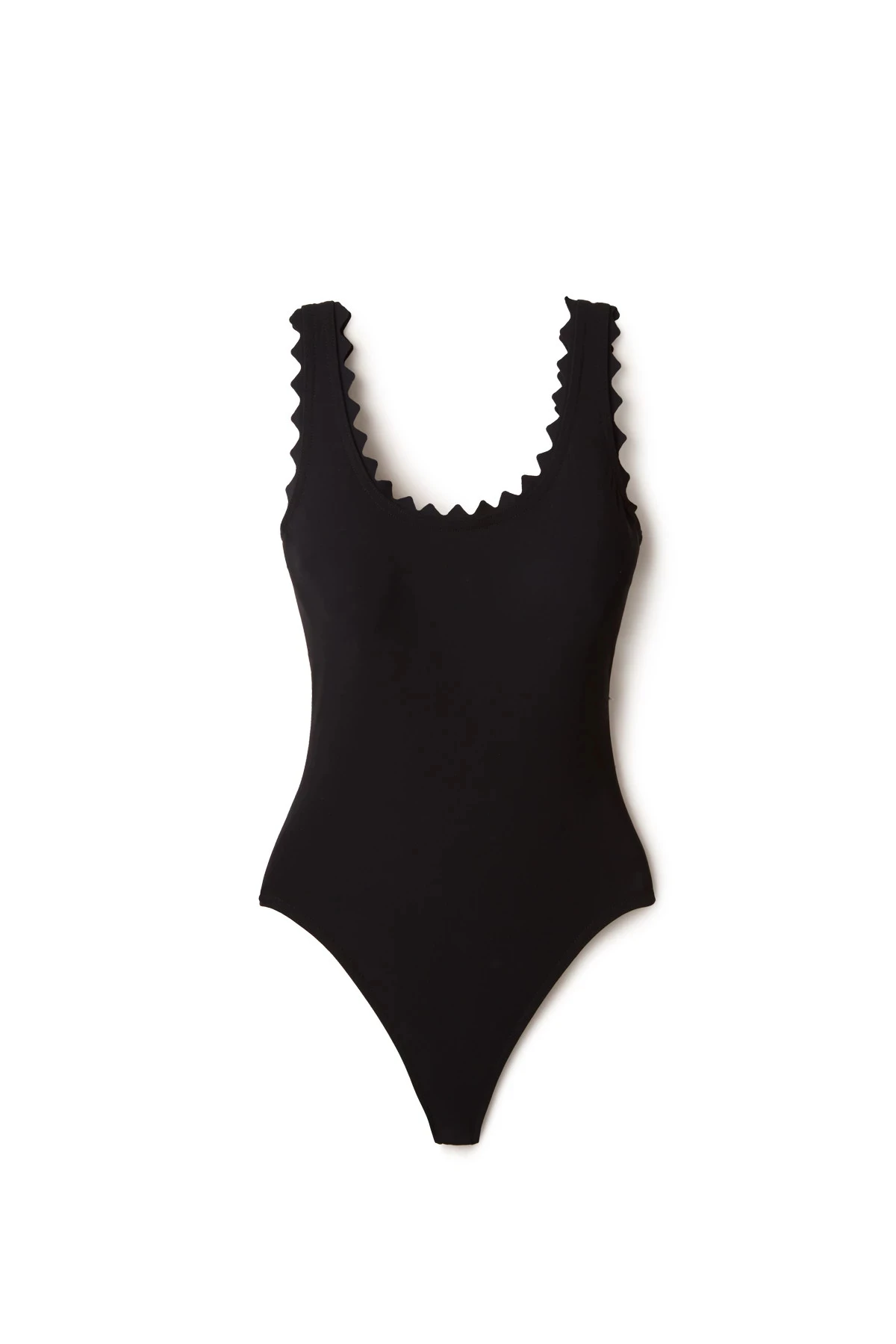 Ines one piece swimsuit features rick rack trim with scoop neck, silent underwire, and wide over the shoulder straps.
