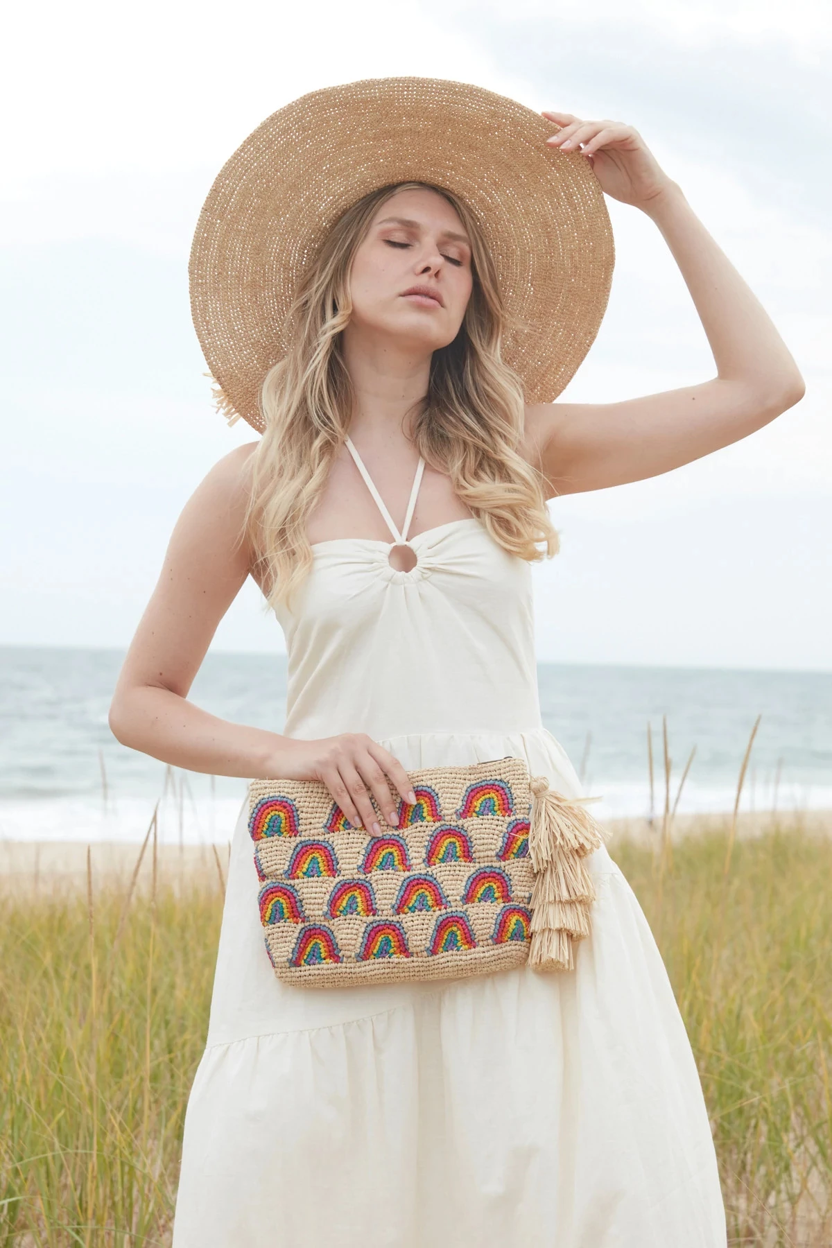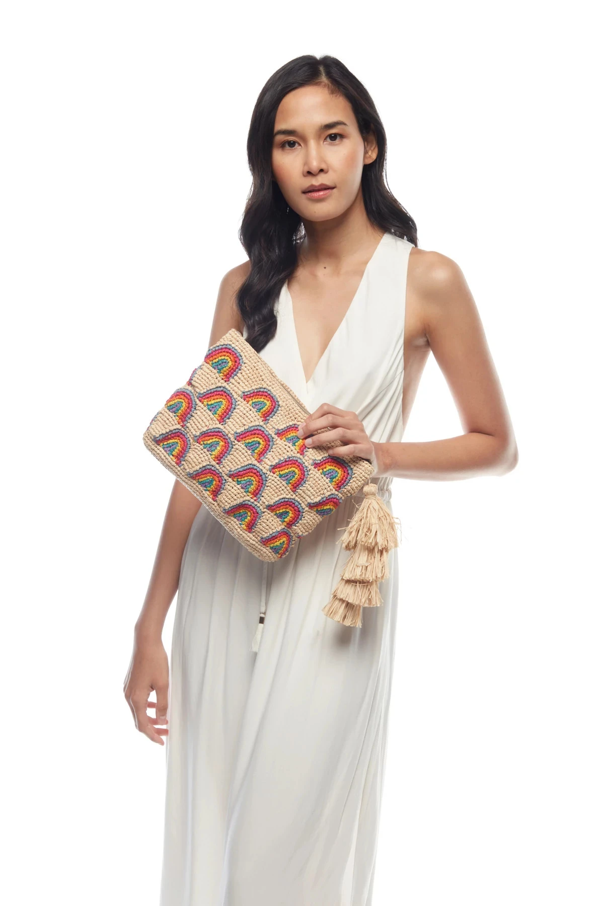 Iris rainbow clutch features crocheted raffia with a cotton lining, tassel detail, and zip closure.