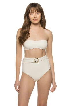 Isla bandeau bikini top features side boning for shape definition and gripper tape to hold in place. Includes removable cups and offers a back clip closure.