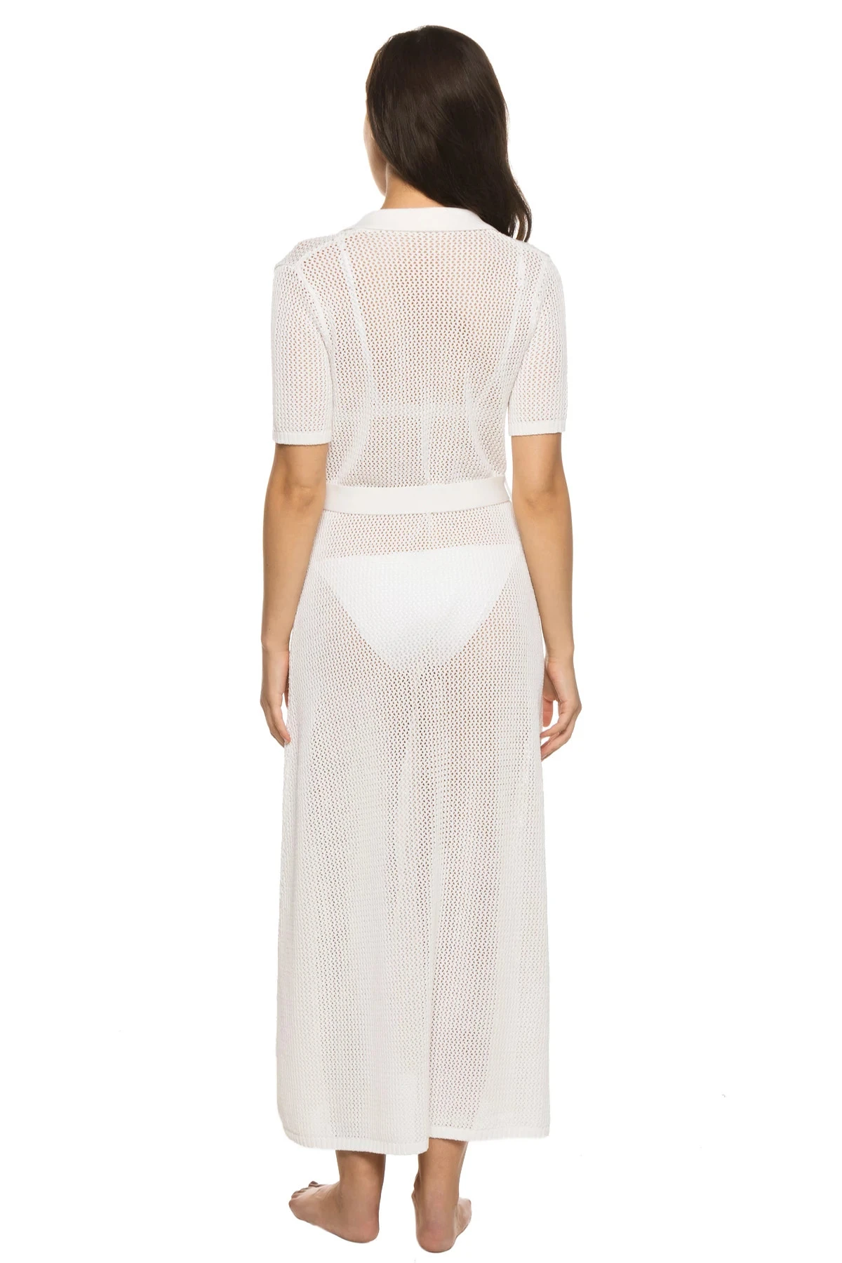 Jada robe features a full length knit fabrication with a collared neckline and fabric belt.