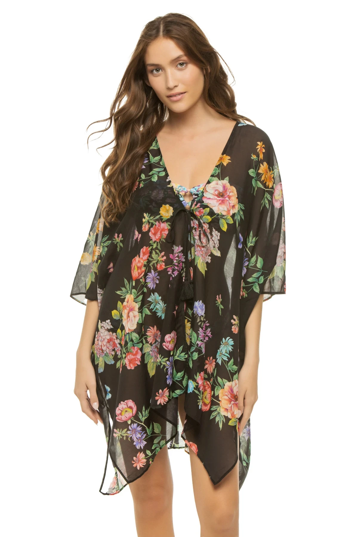 Kimono features an elegant floral print with 3/4 butterfly sleeves and a tie front with tassels.