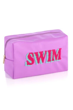 Joy pouch features a bold “SWIM” graphic and offers a zip closure.