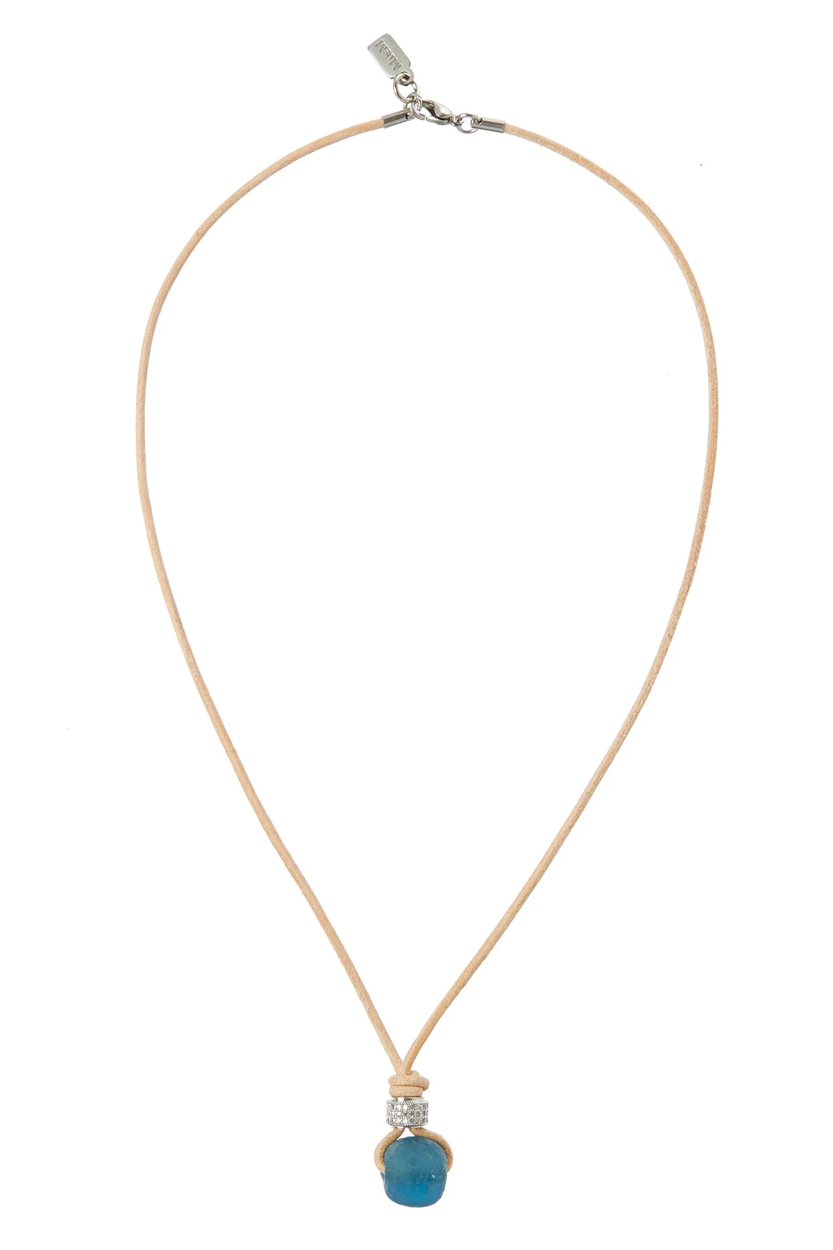 Tan leather necklace features a single seaglass bead with platinum cubic zirconia bead. Lobster clasp closure.