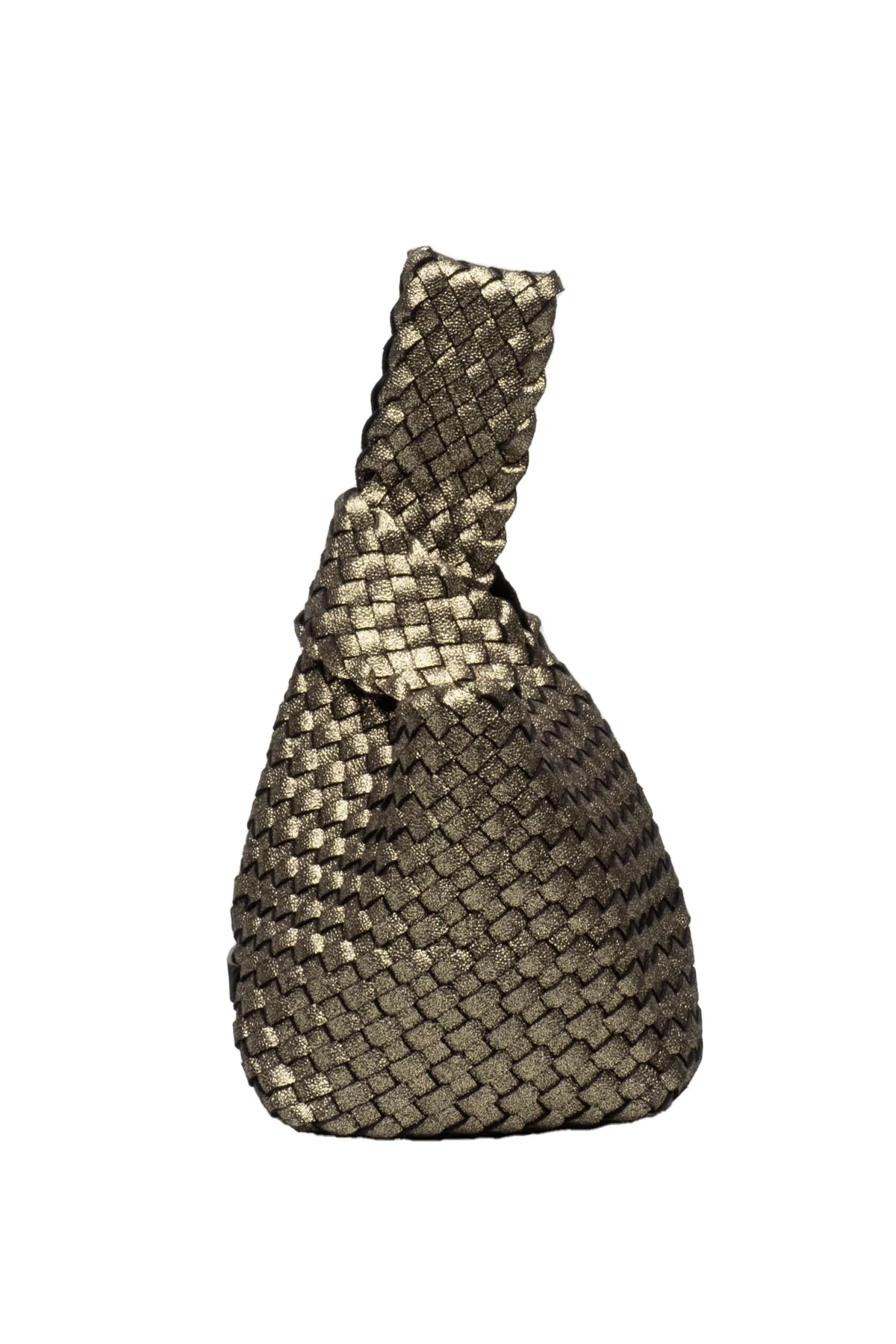 Kyoto clutch features a handwoven neoprene fabrication offering an open top with a crossover double strap closure.