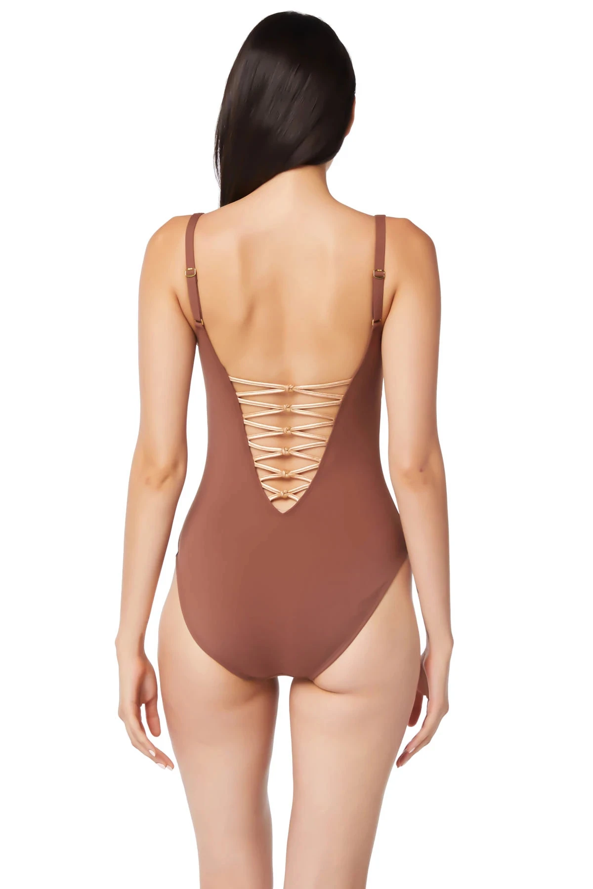 One piece swimsuit features a plunge v-neckline with a lace up detail and removable cups.