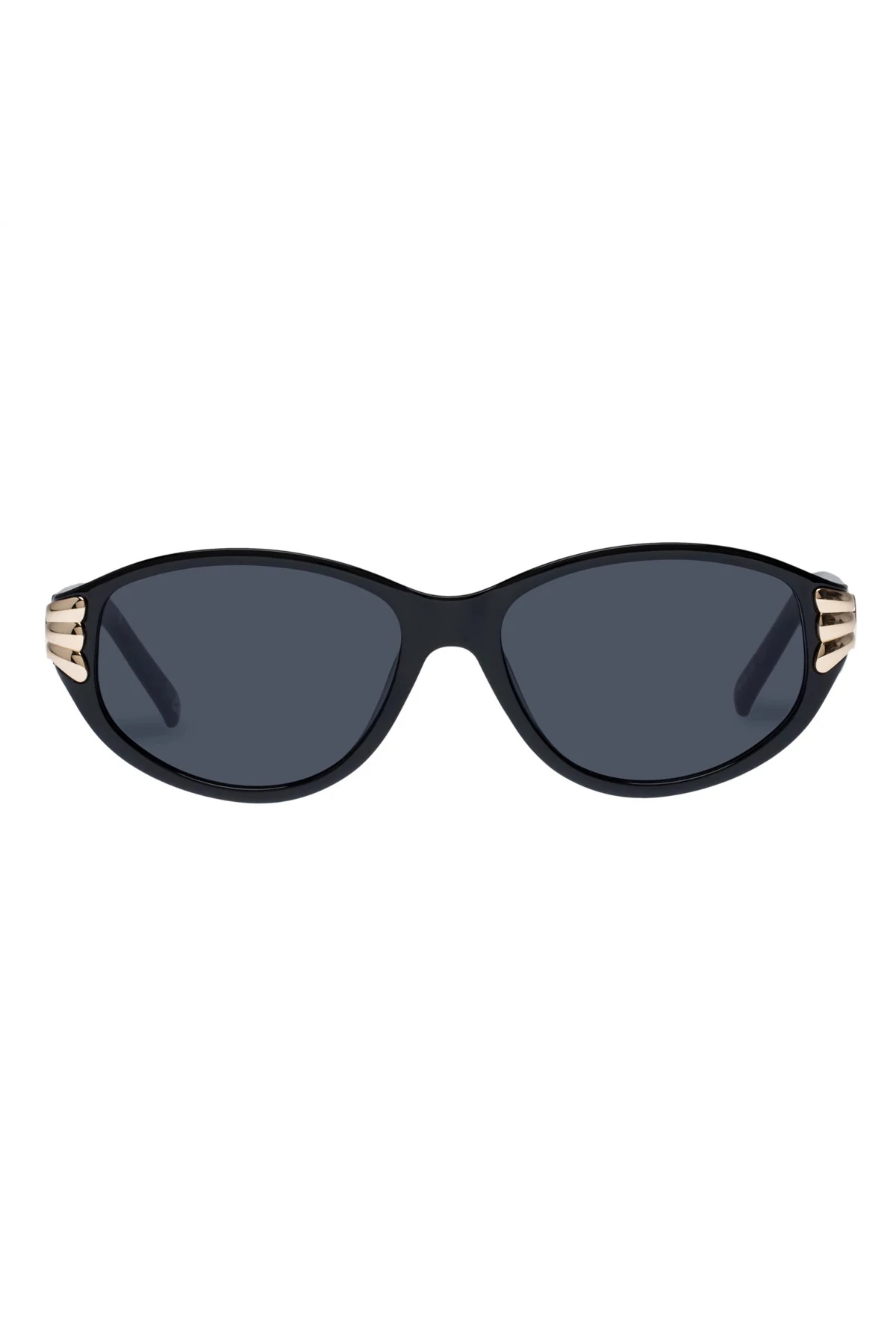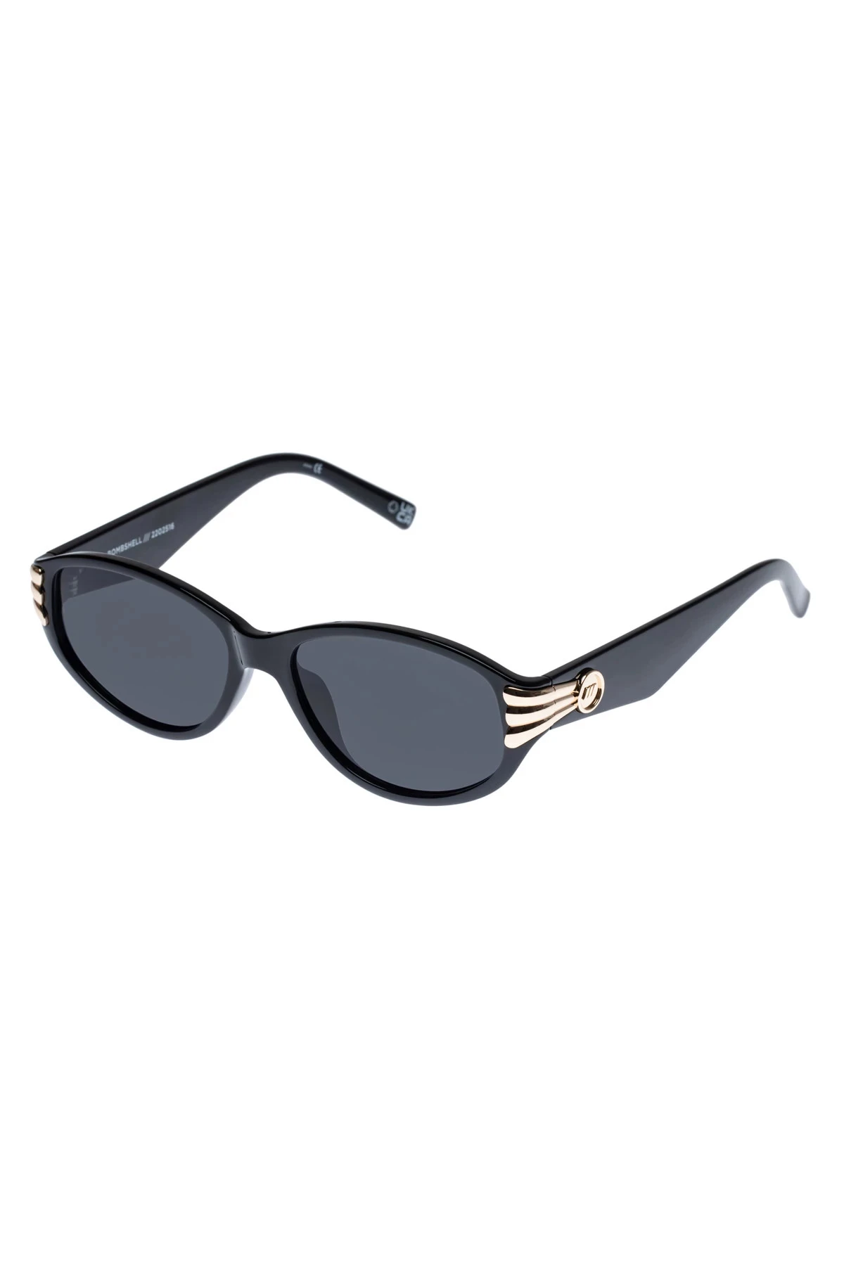 Bombshell sunglasses feature a retro round frame with art deco inspired accents. Includes Le Specs protective pouch and microfiber cleaning cloth.