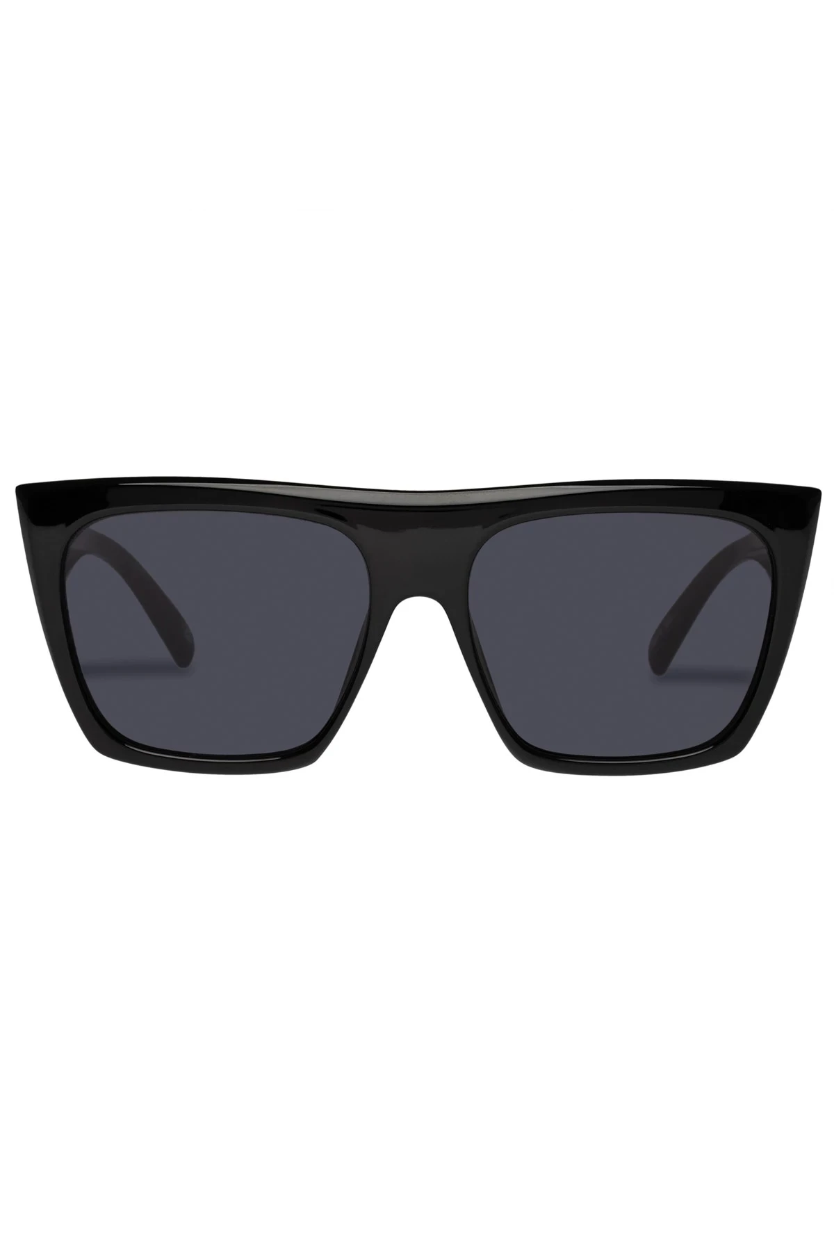 The thirst square frame sunglasses with dark lenses is a flat brow rework on a classic silhouette. Le Specs protective pouch and microfiber cleaning cloth included.