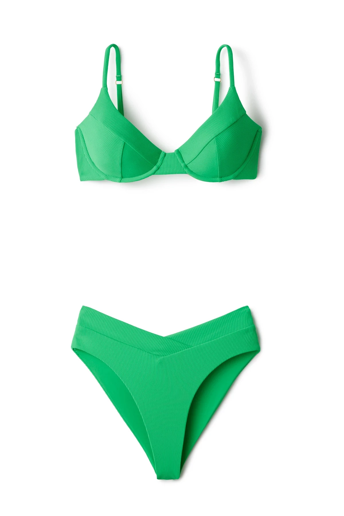 Lido high waist bikini bottom features a v-front banded waist and a rib texture fabrication. Offers a high leg cut and moderate coverage.