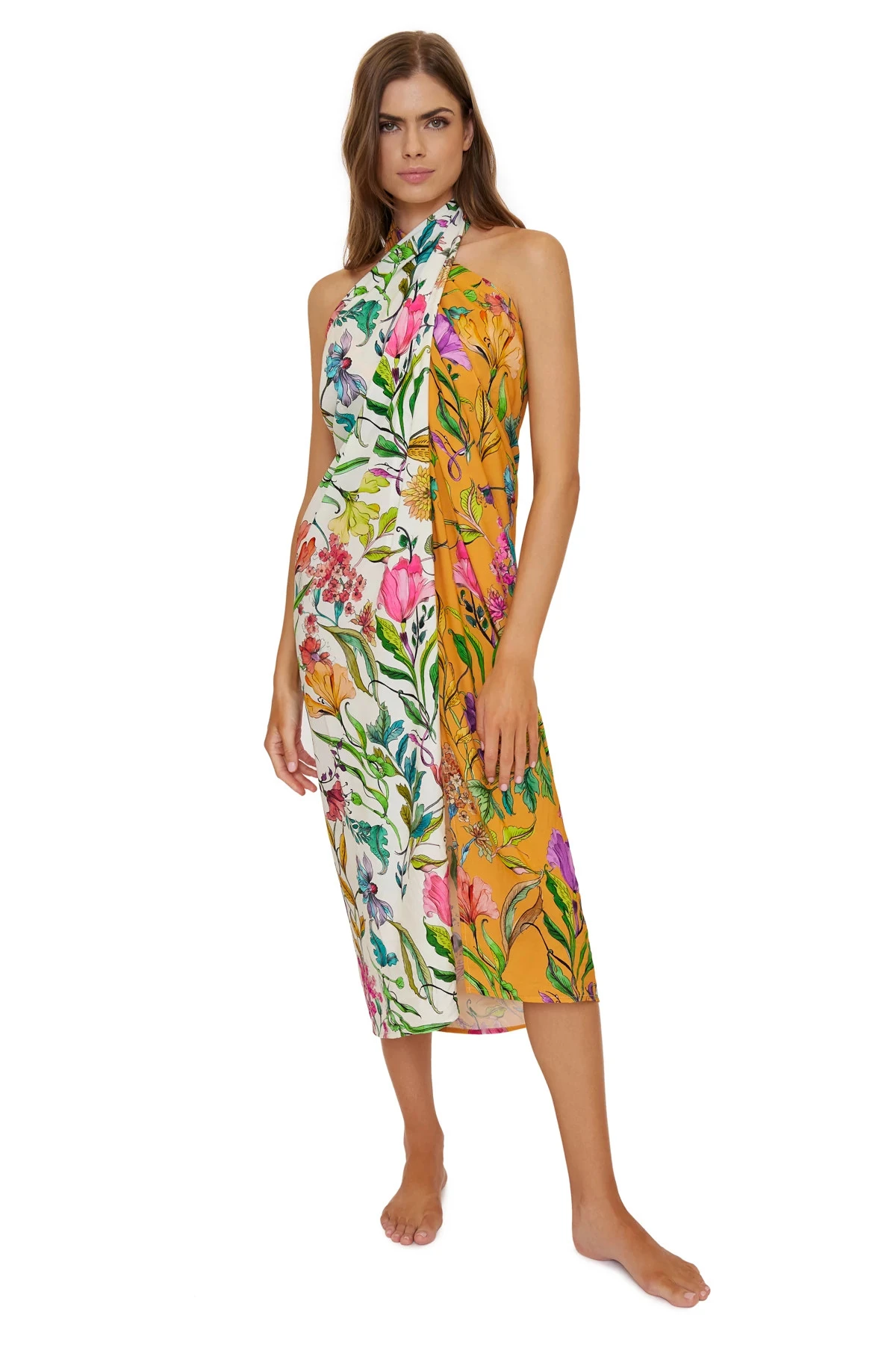 Long floral sarong offers a variety of wear options with self ties at waist.