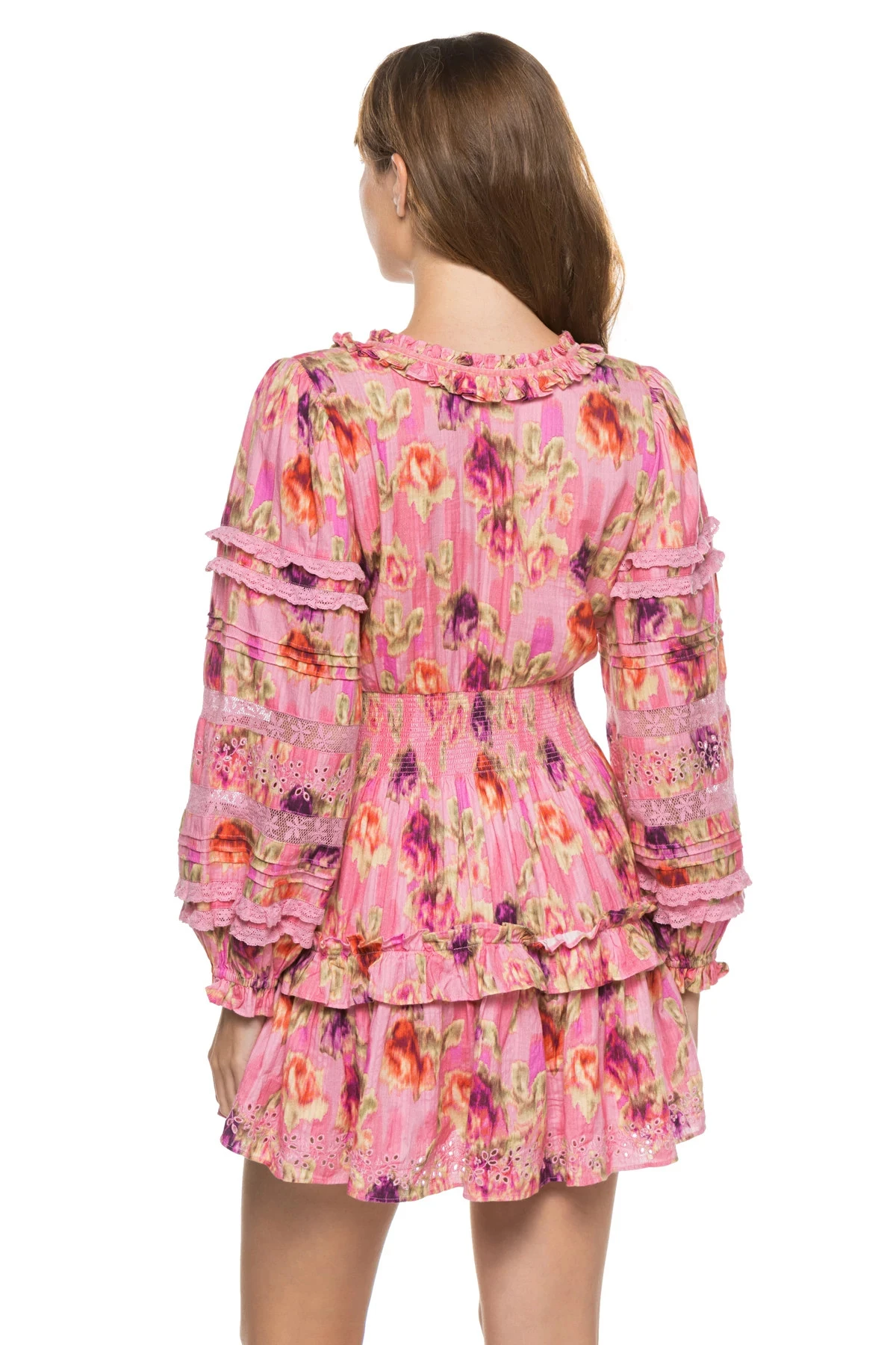 Clarkie mini dress features a floral print with a split ruffled neckline that offers long sleeves, loose ties, a smocked bodice, and a tiered ruffle skirt.
