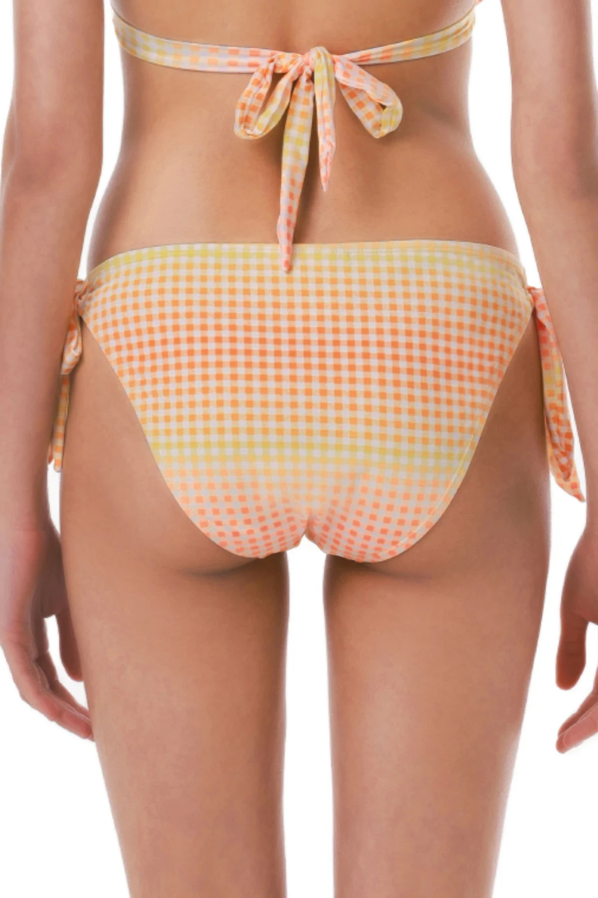 Hipster bikini bottom offers thick ties at hips and moderate back coverage.