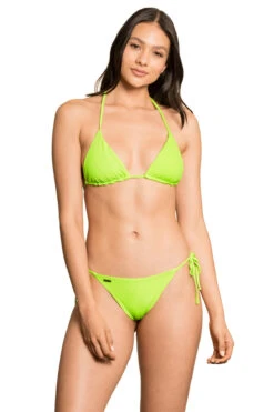 Balmy triangle bikini top features a ribbed solid to reverse print with sliding cups and removable padding. Offers adjustable ties around the neck and back.