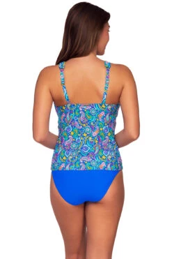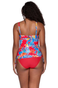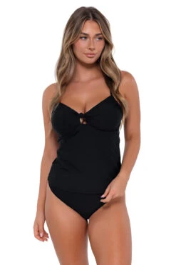 The Maeve Tankini is your new cute classic. With a cinched knot, keyhole detail, and adjustable bust coverage, this top is a favorite. It features removable cups, adjustable straps, a hidden bra hook and eye closure, and an underwire. Its relaxed fit provides just enough shape without being form-fitting.