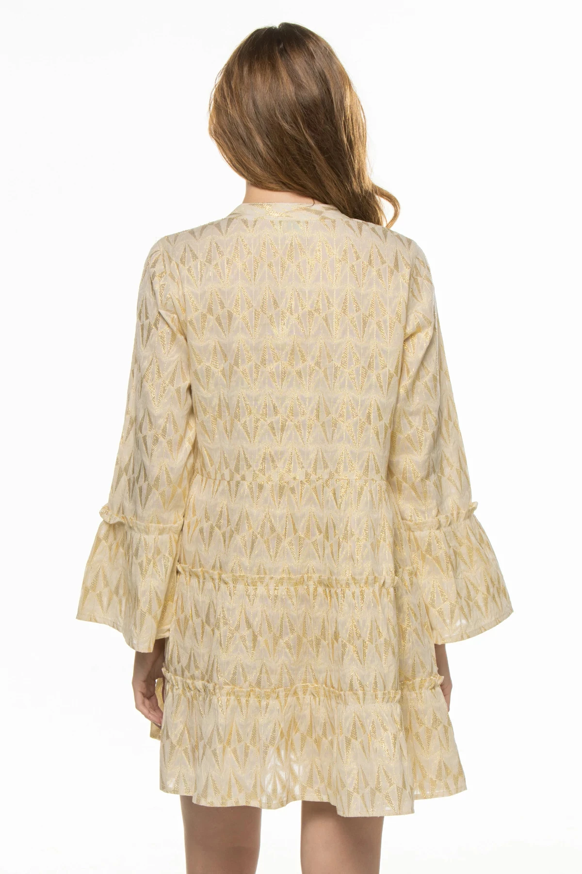 Long sleeve dress features a metallic pattern and offers a tiered skirt and a split neck with button closures.