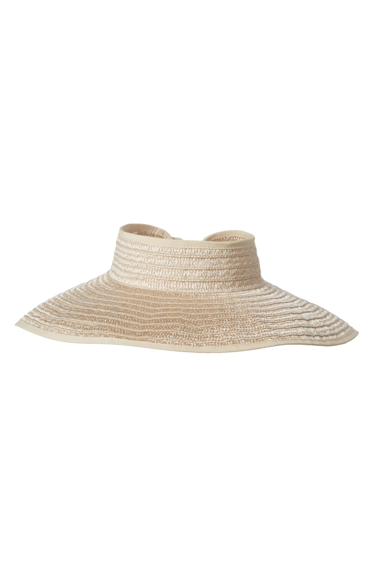 Metallic paper straw visor with bow at the back. Offers UPF 50 sun protection. Packable.