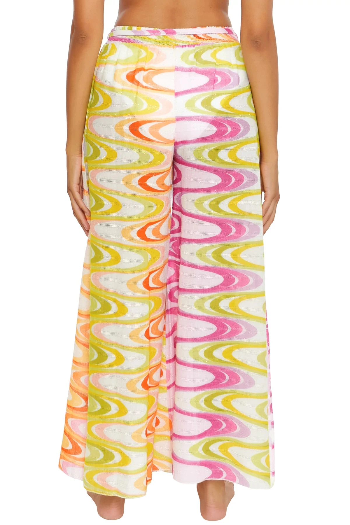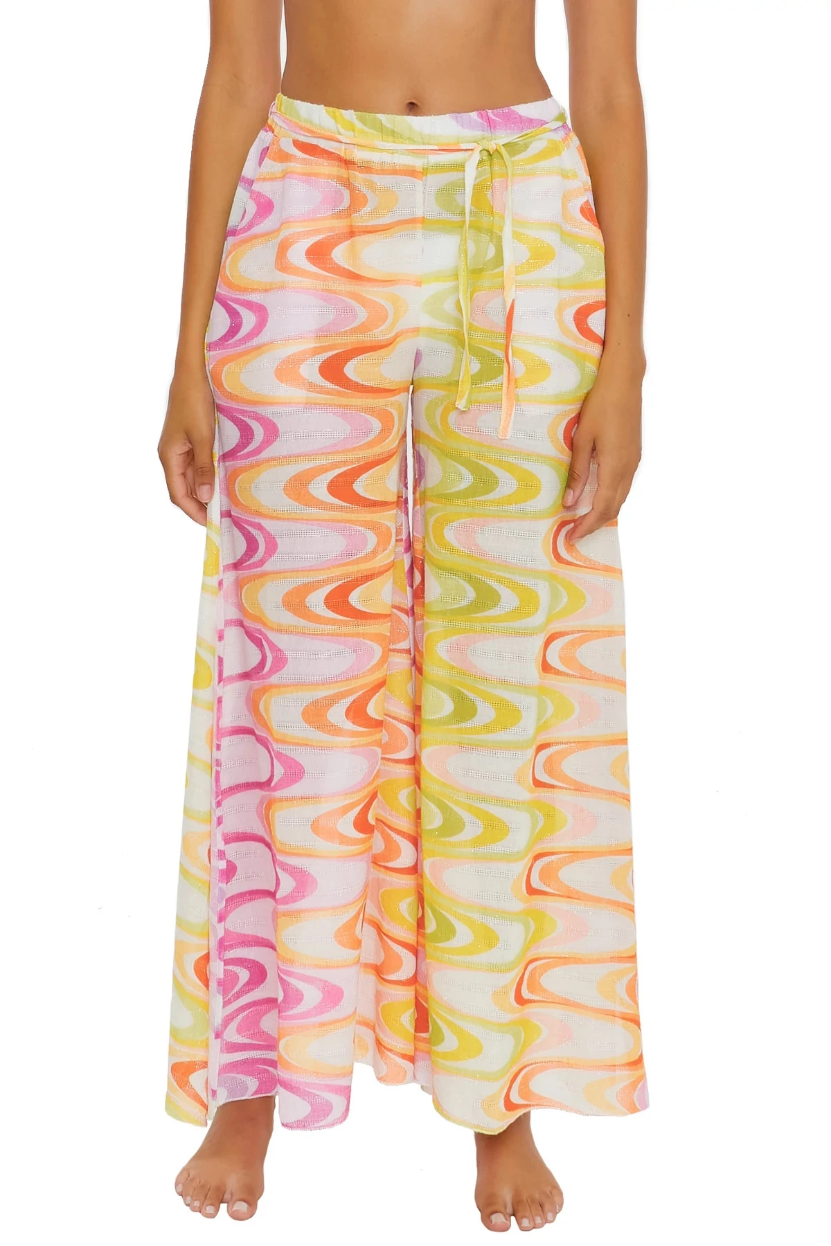 Metallic pants feature a retro optical geo print with side slits and offers an elastic waistband.