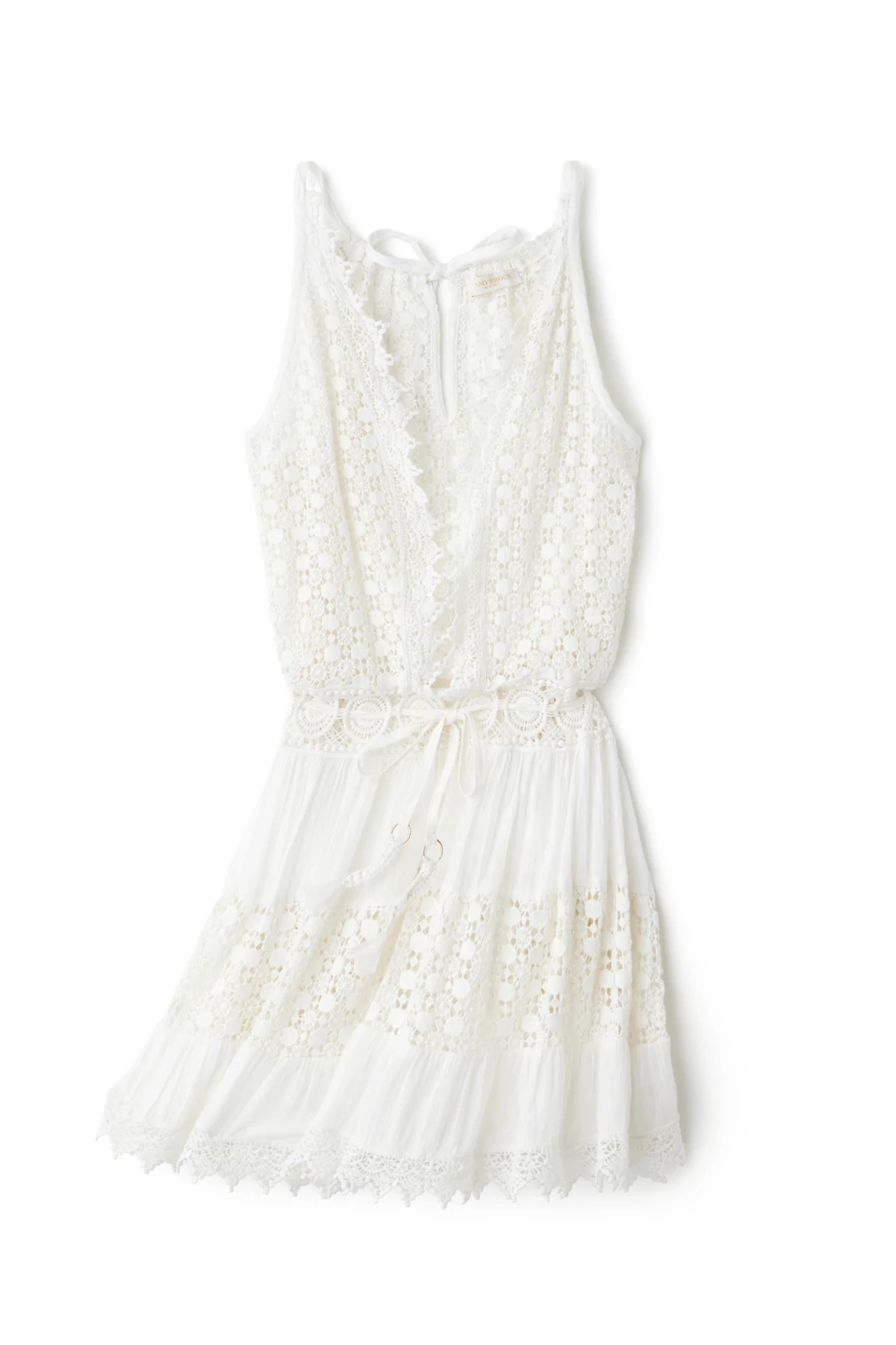 Miranda mini dress is a sleeveless crochet dress with a halter neck featuring a deep plunging neckline, a flowy skirt with crochet lace insets and a cinch waist that offers adjustable ties.