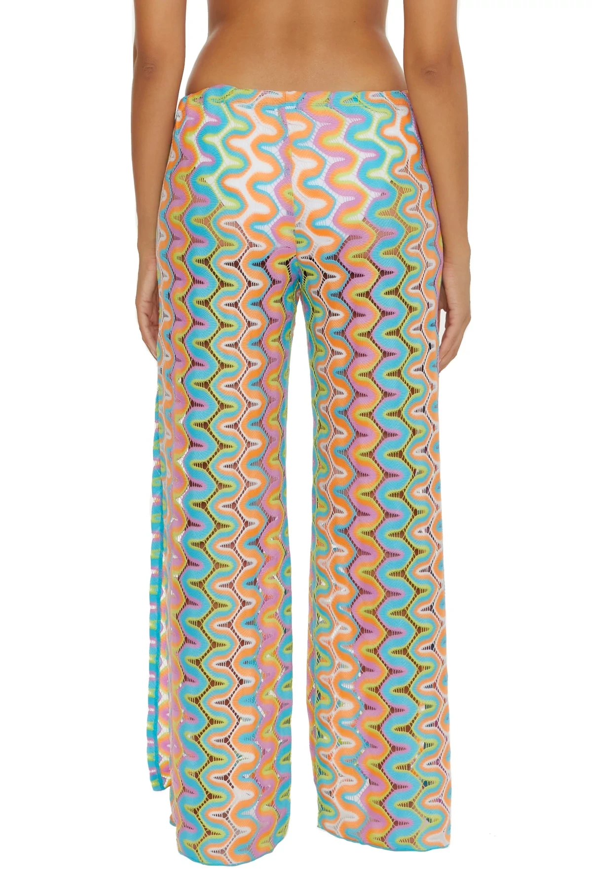 Modwave pants features a colorful open weave crochet with side slits and an adjustable drawstring waist.
