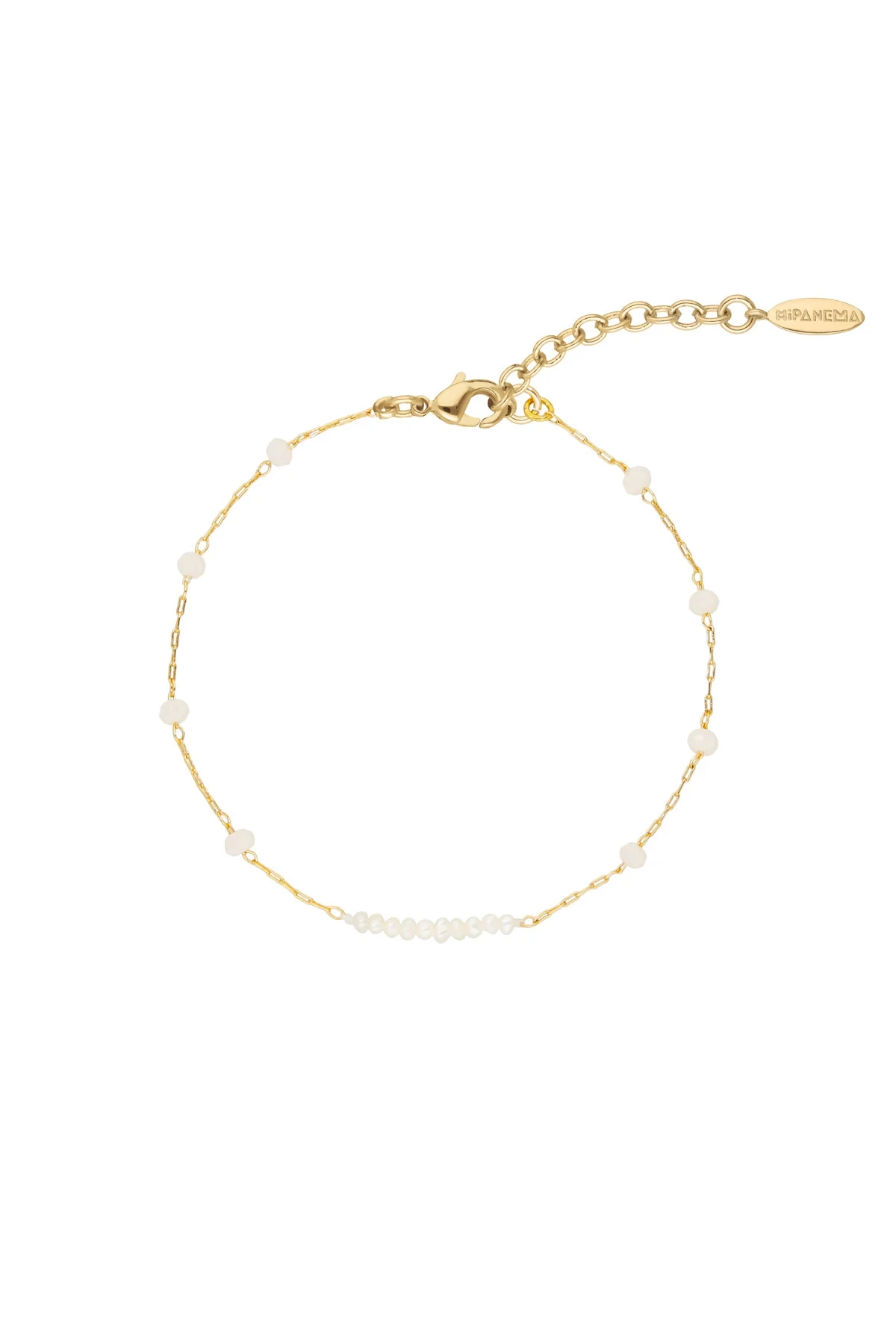 Monday bracelet features a gold chain with pearl details and offers a lobster clasp closure.