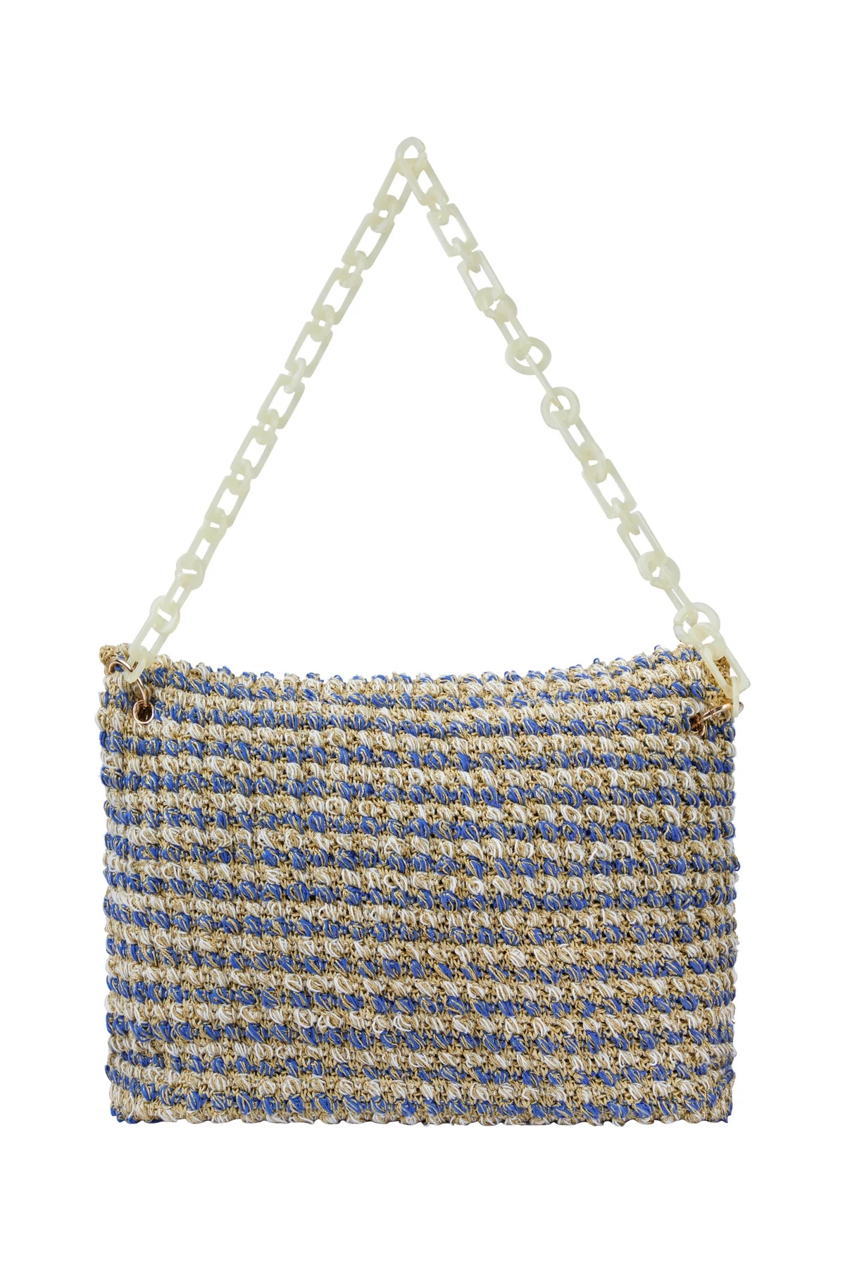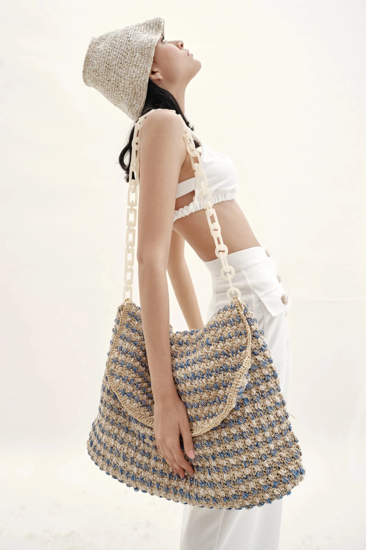 Nautique oversized handbag features an intricate hand knit pattern reminiscent of the classics. Fits everything and more and is fully lined with a plastic-link chain strap and flap closure.