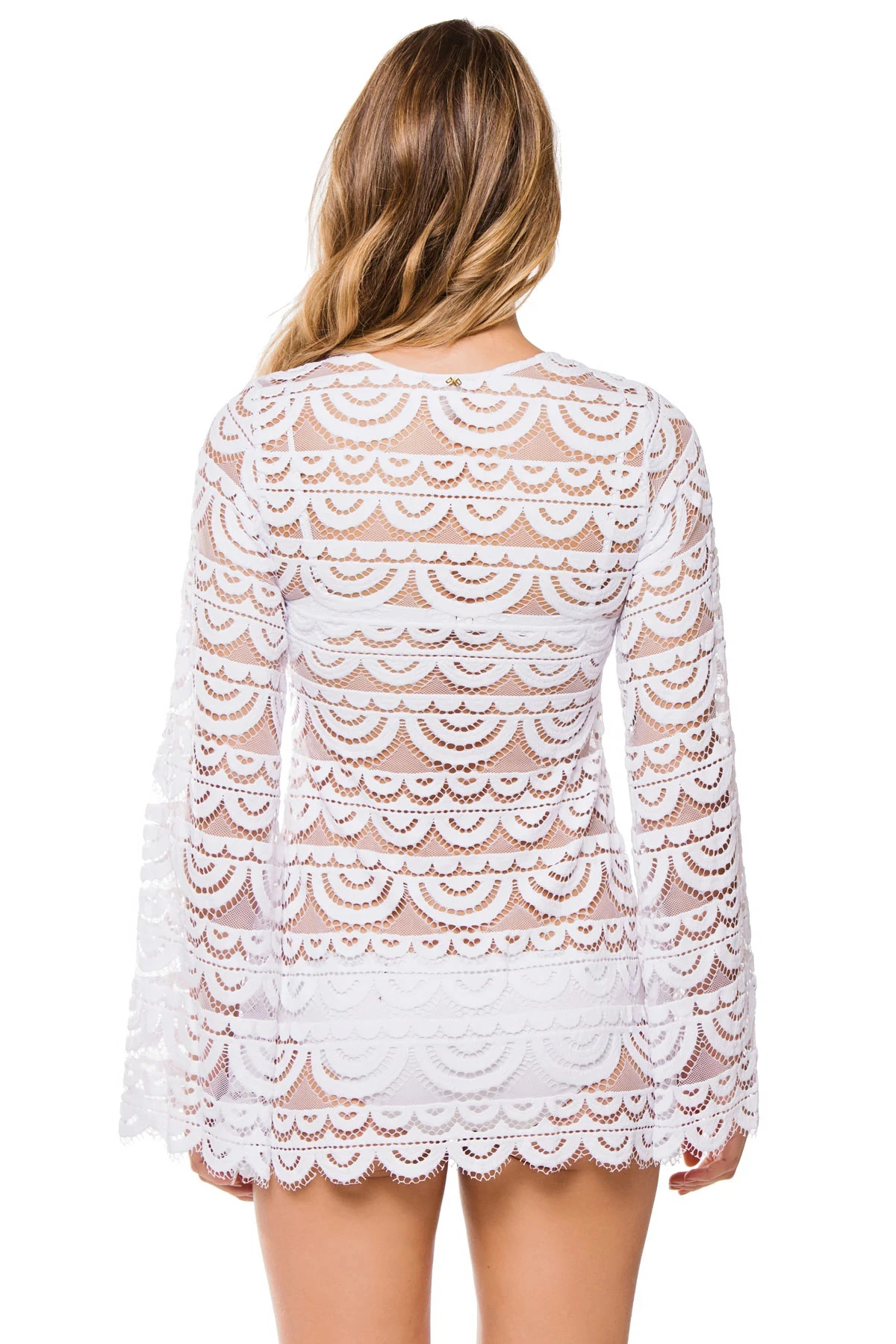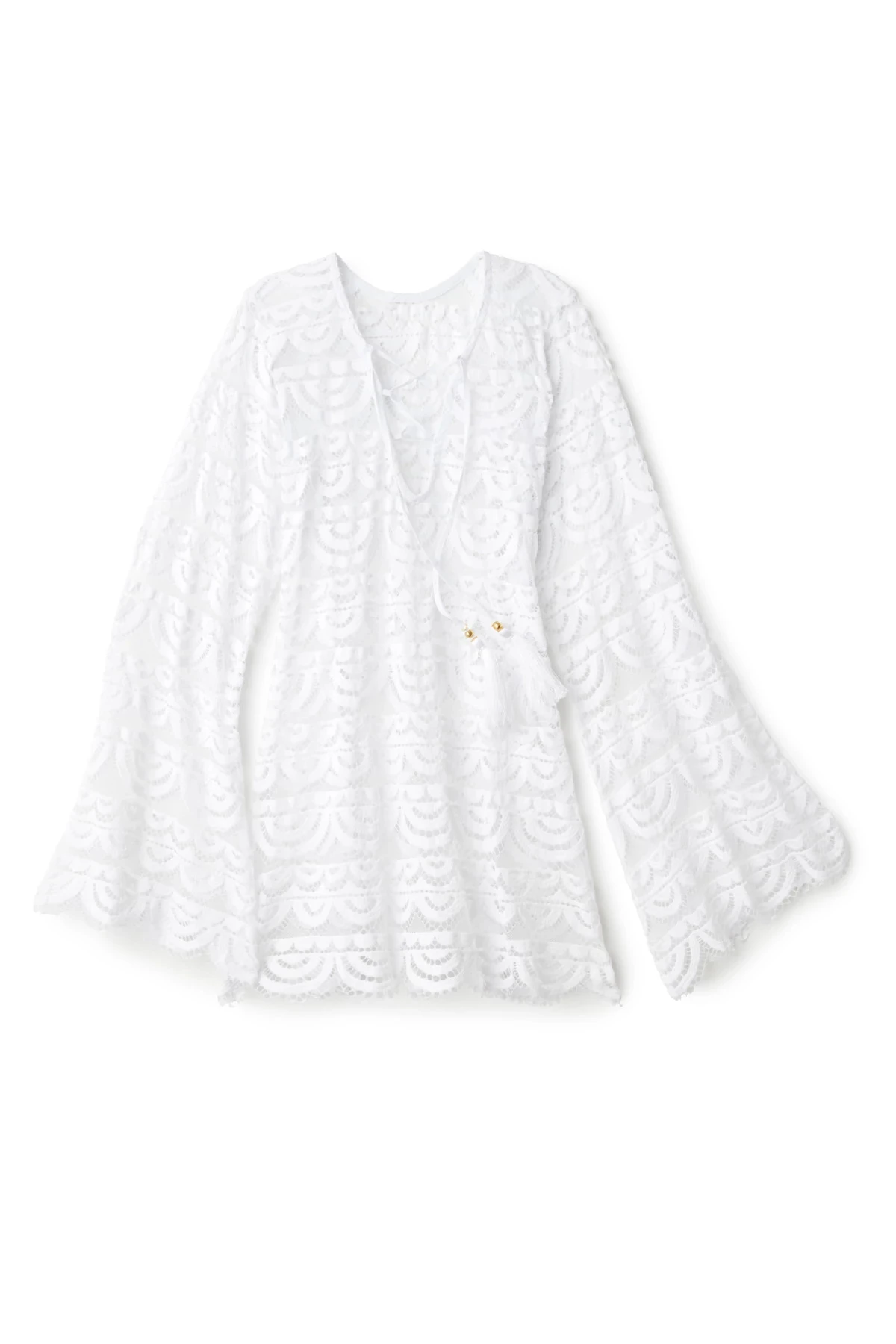 Noah crochet lace tunic with lace up tassel ties at front, long sleeves and scalloped hem.