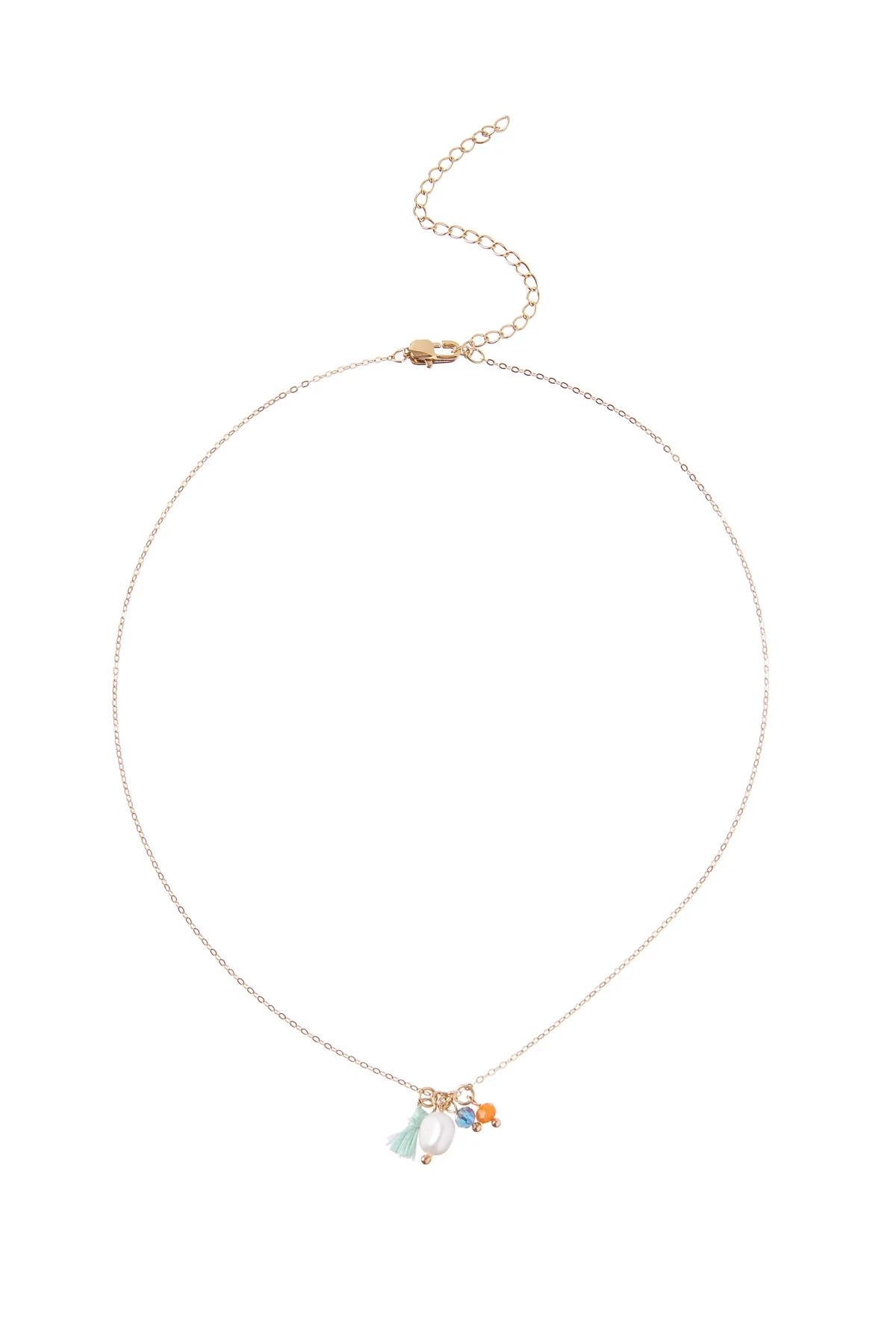 Necklace features bead, pearl and tassel charms and offers a lobster clasp closure.