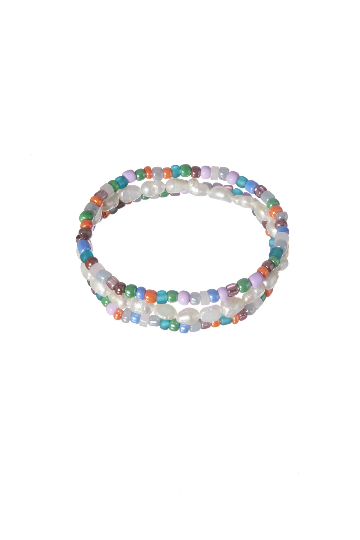 Bracelet features three stacking bracelets offering pearl and multi-colored beads.