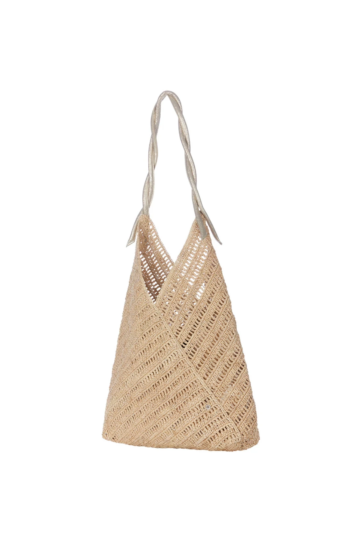 Panama lux tote features a crochet raffia with metallic threading and leather trim.