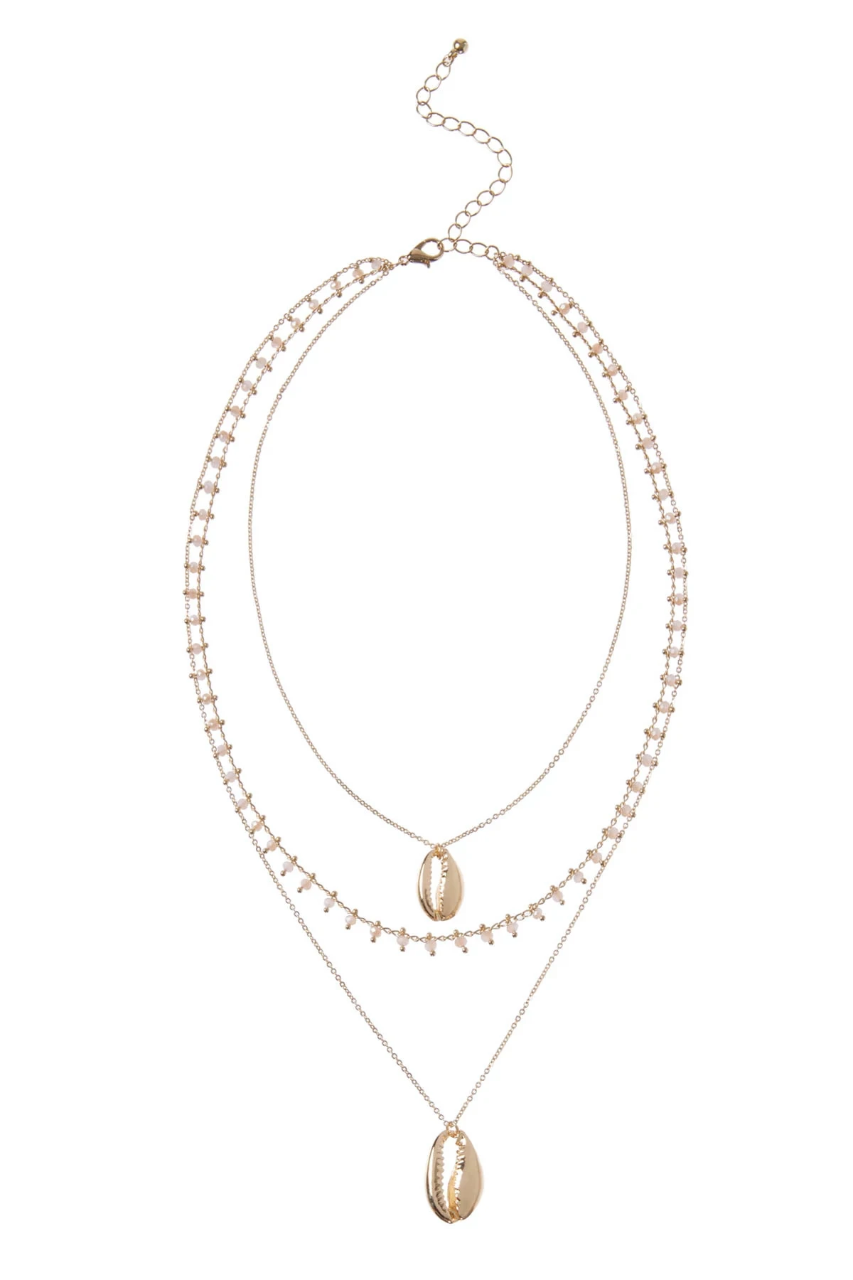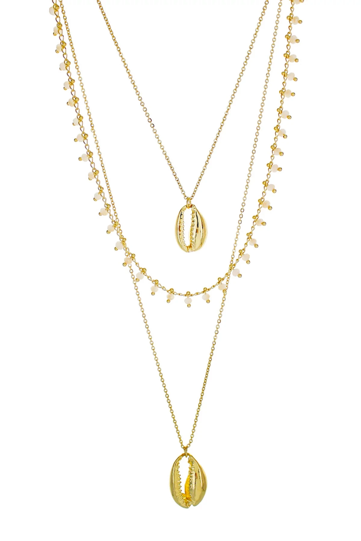 Necklace features layered chains with gold sea shell and beaded accents.