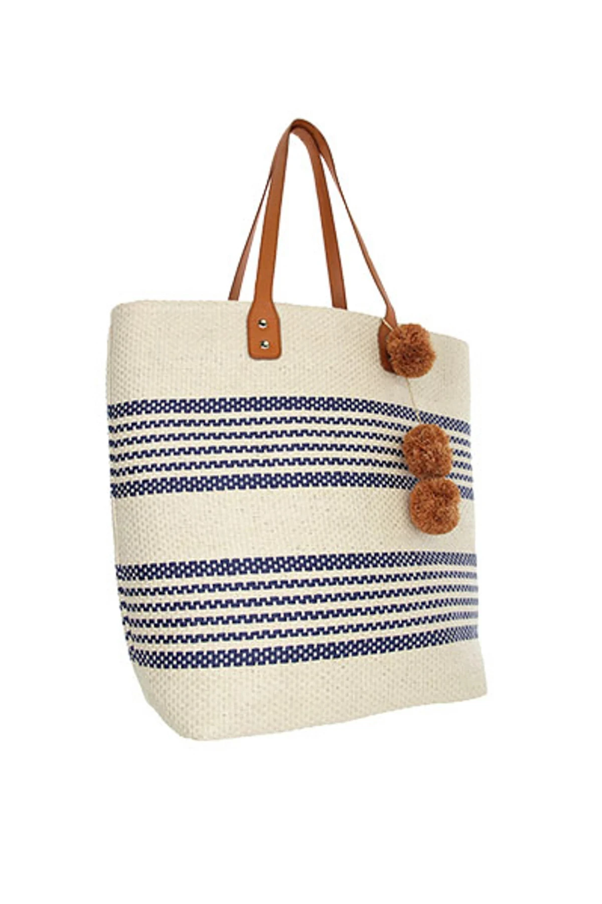 Raffia tote features double top handles accented with a pom pom tassel.