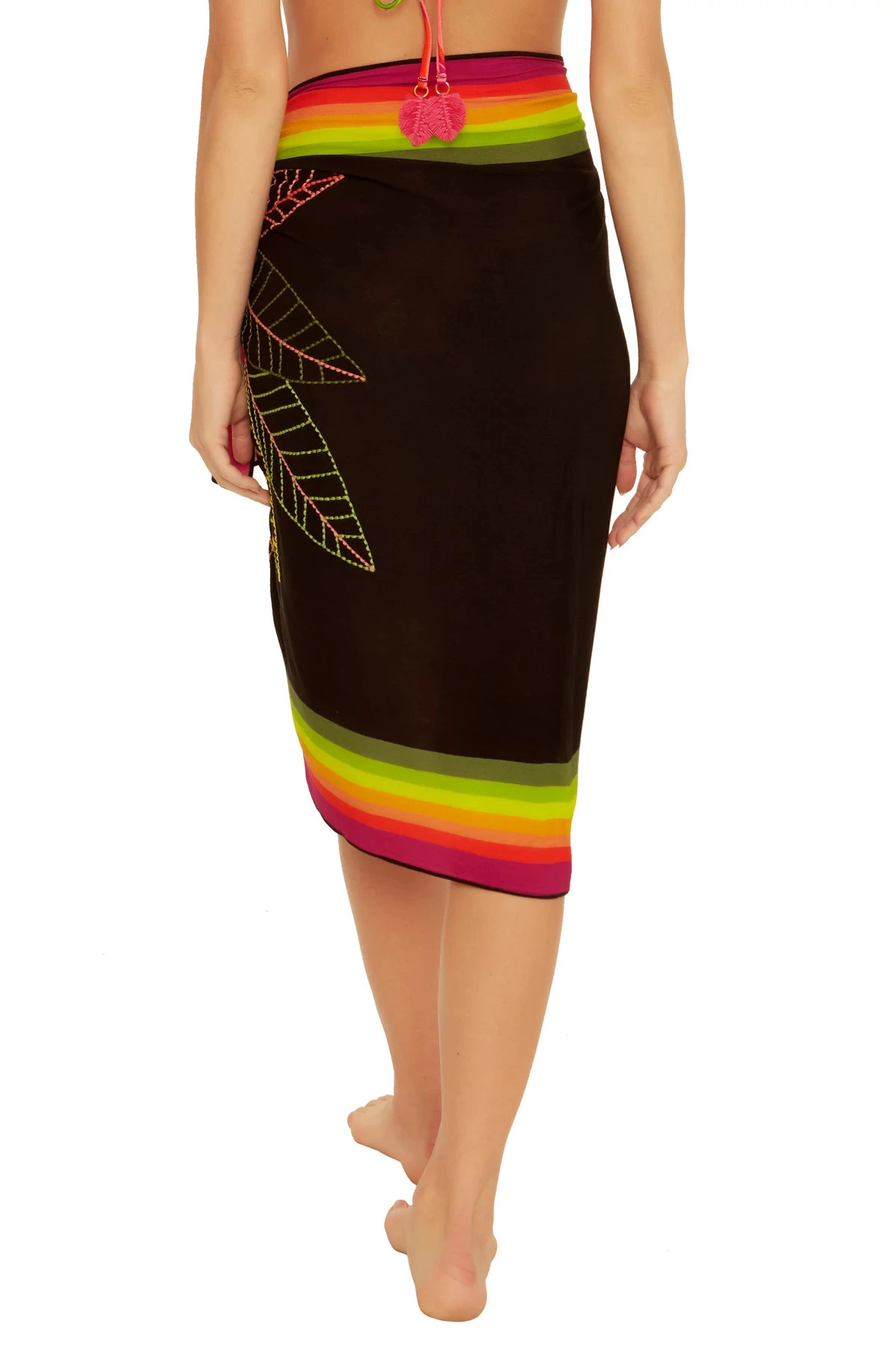 Rainforest pareo features a colorful tropical embroidery detail offering ties at hips and can be worn long or short.