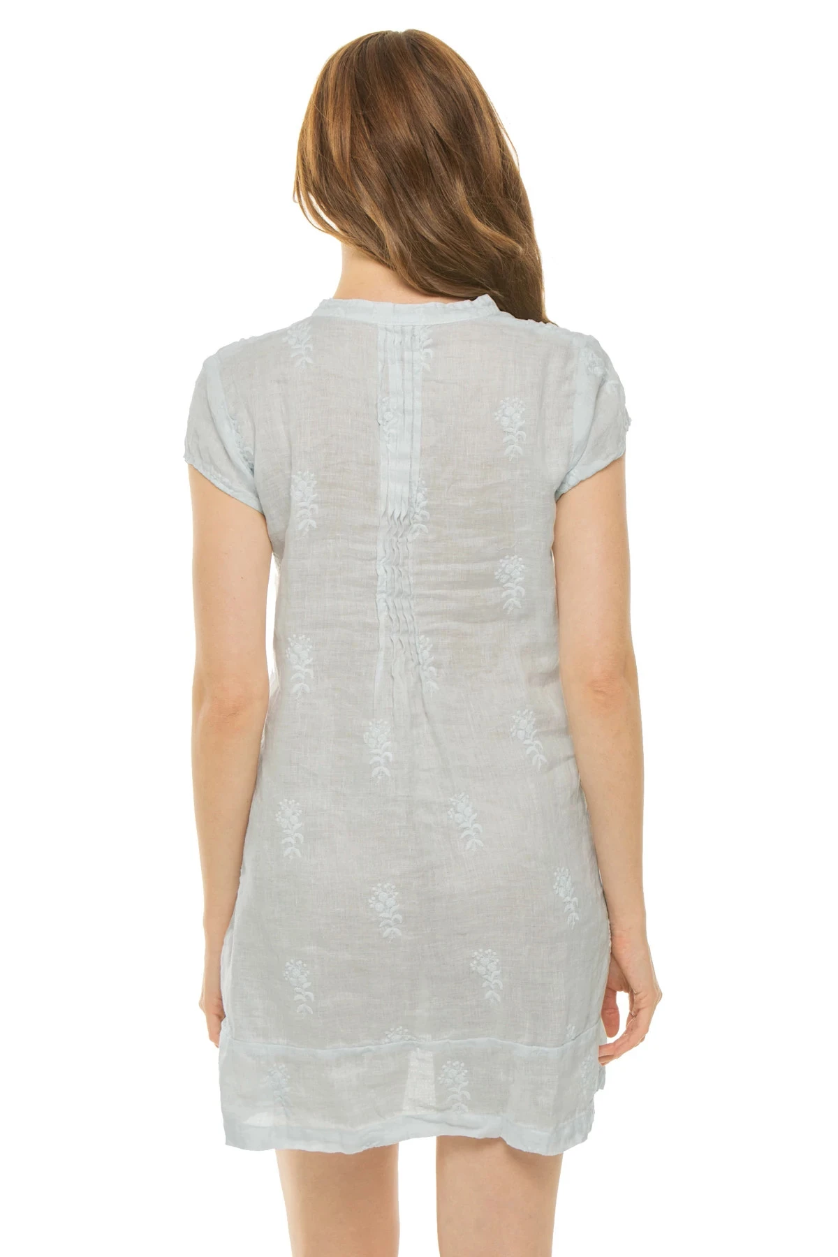 Regina tunic features a cap sleeve, pleat detail and v-neckline.
