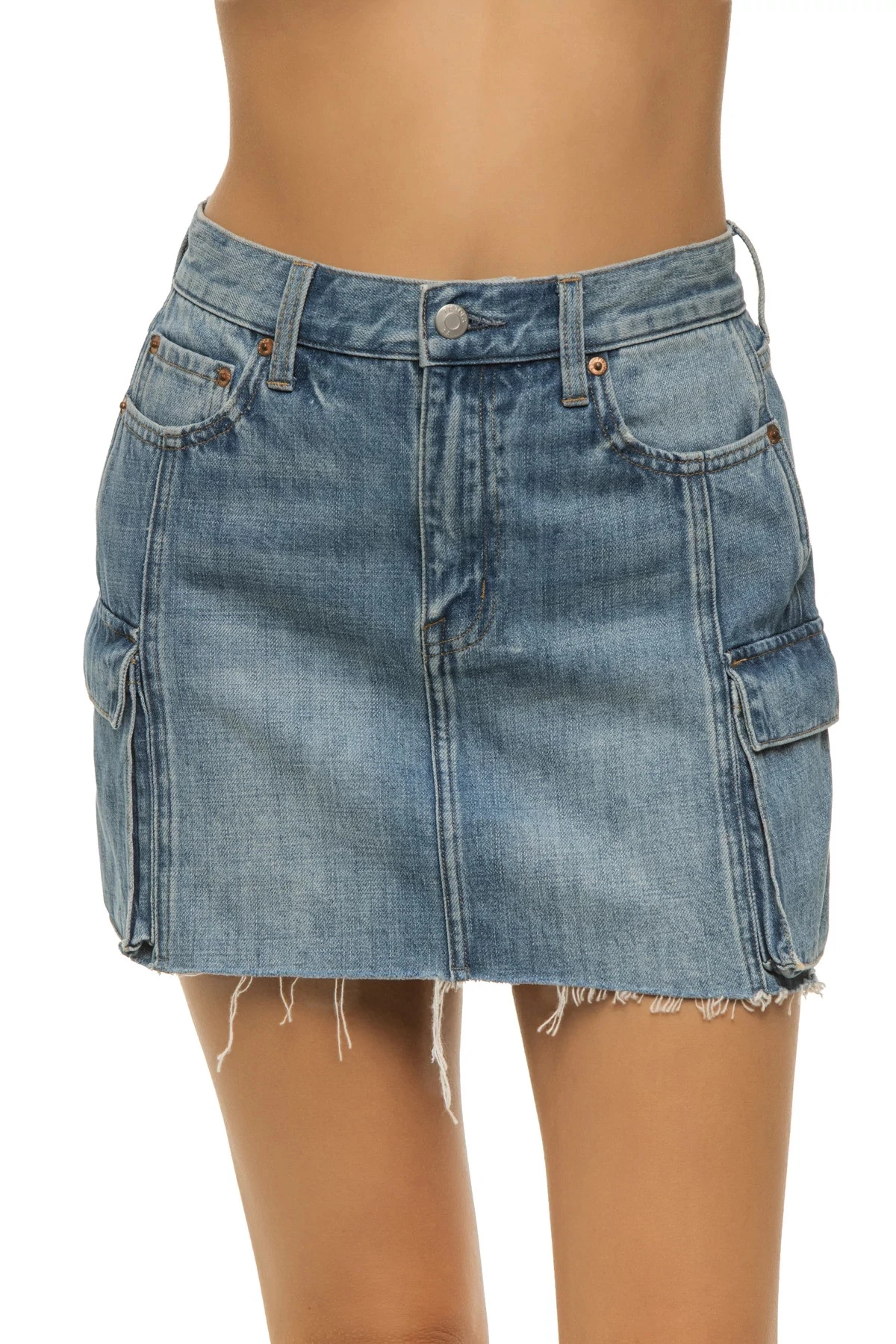 Rhea denim mini skirt features a raw distressed hem with a high rise fit and side pockets.