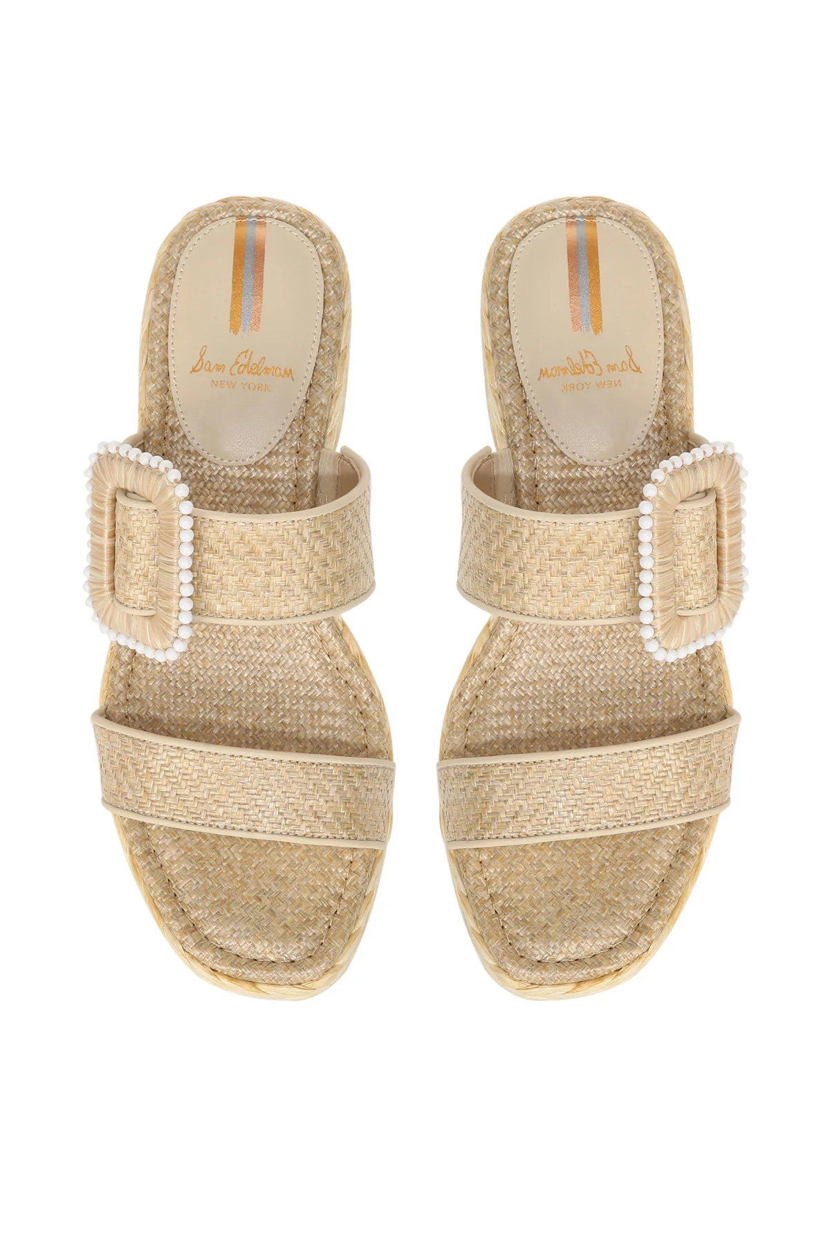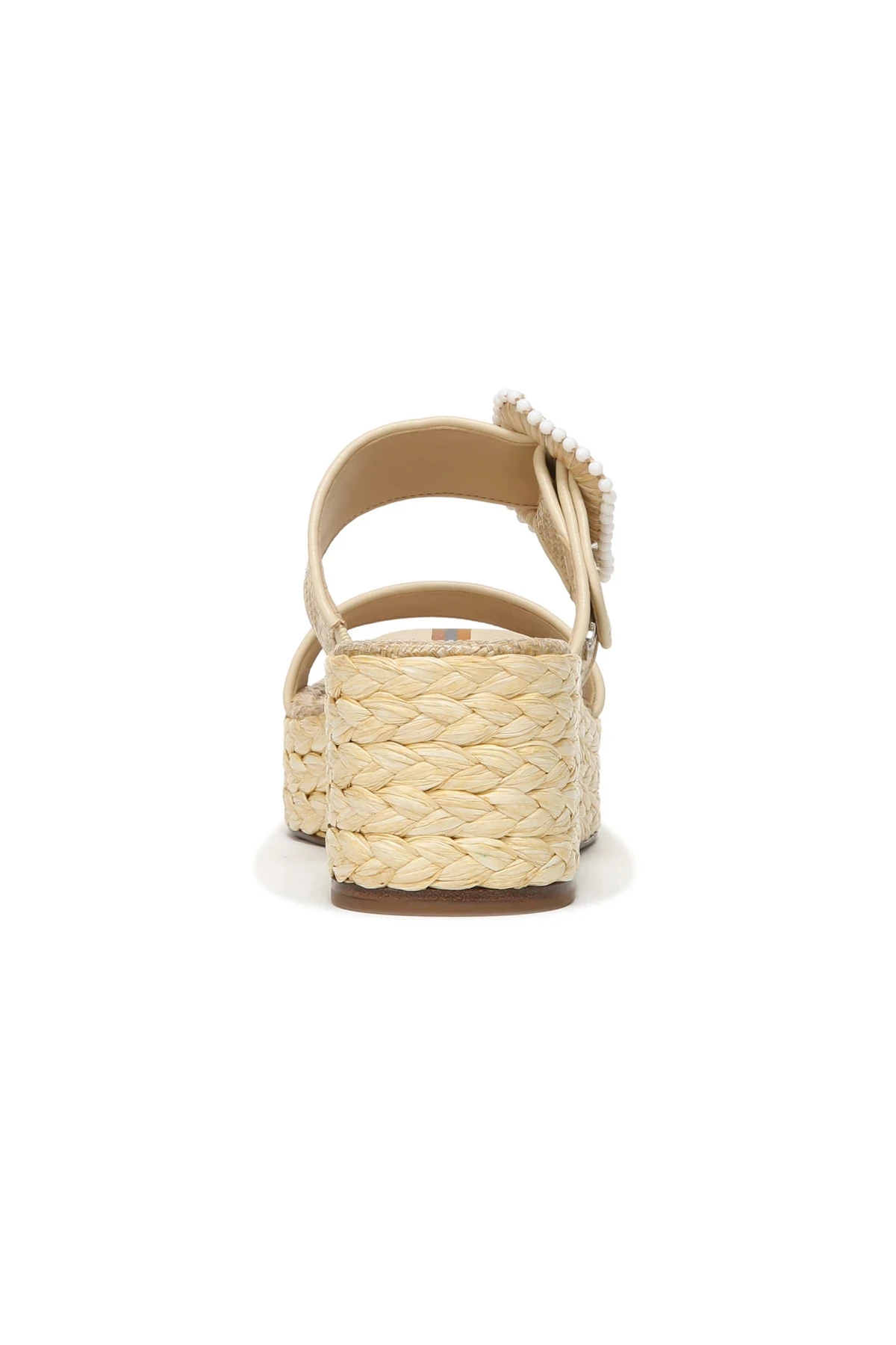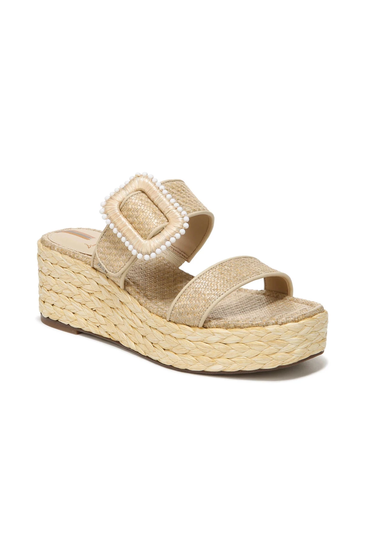 Chase wedge features an open toe with thick straps and an oversized buckle with bead detail.