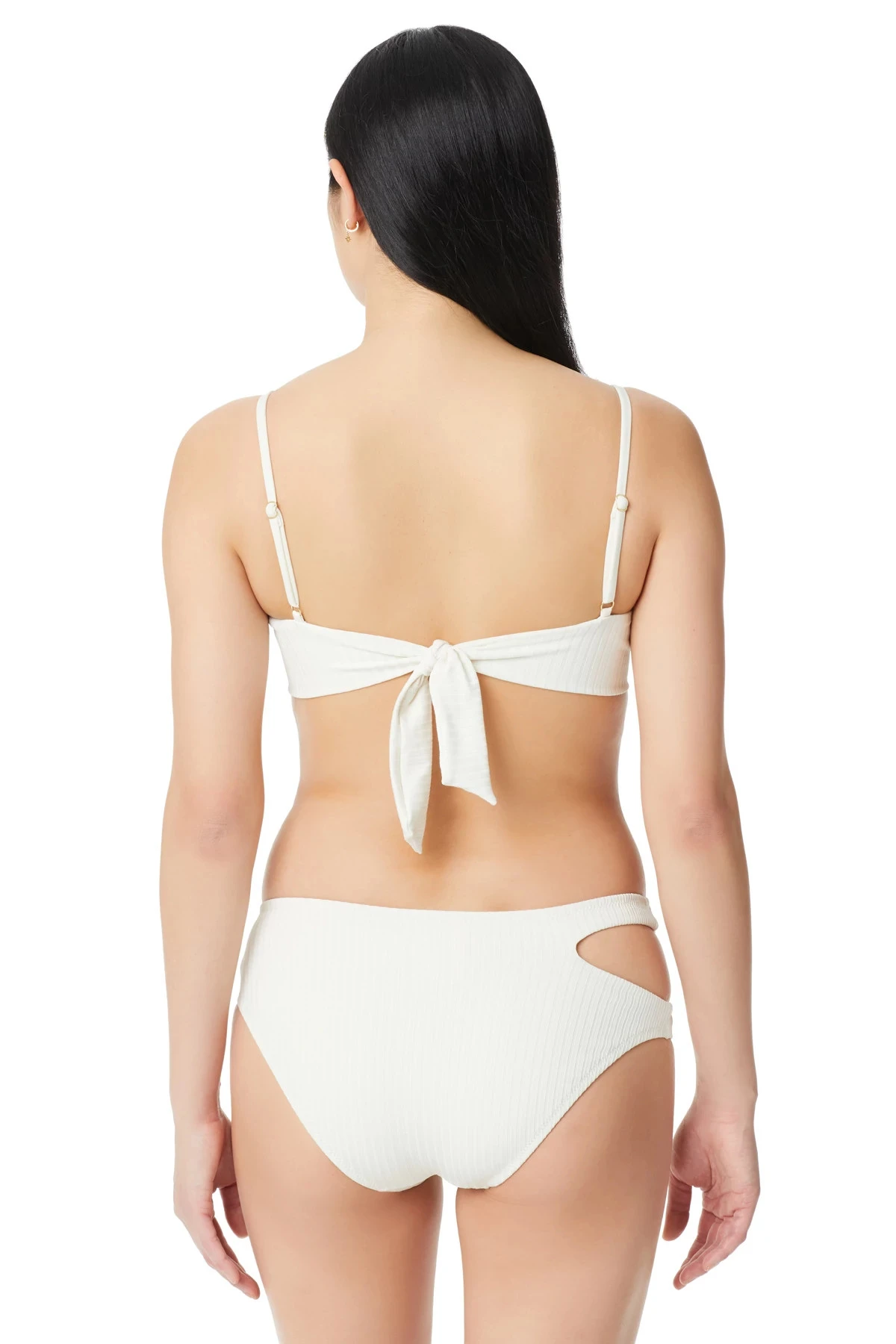 Bandeau bikini top features a v-wire detail in a ribbed texture fabrication. Offers thin over the shoulder straps.