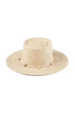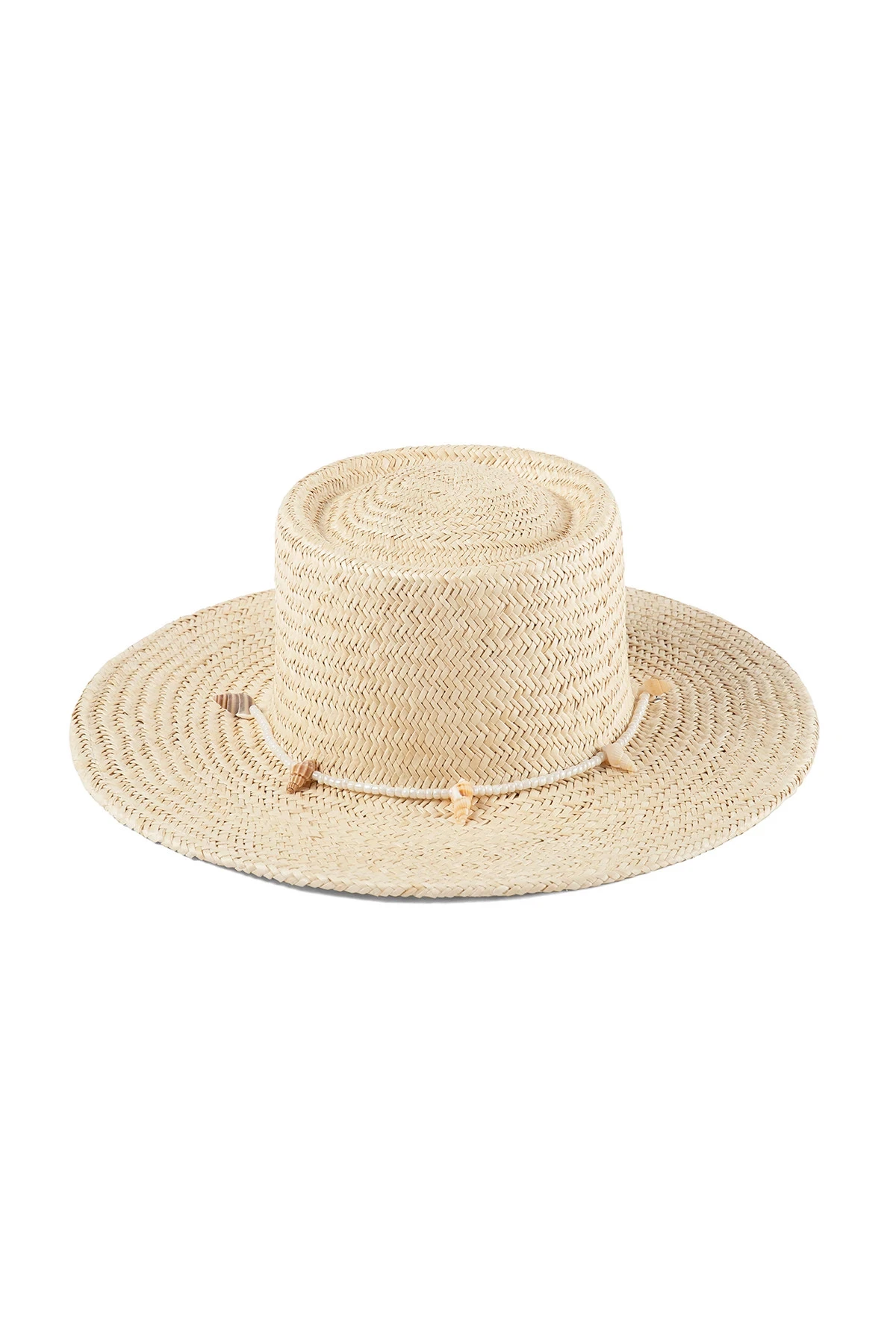 Seashells boater hat features a paper straw woven construction with a decorative chin strap and a beaded seashell band.