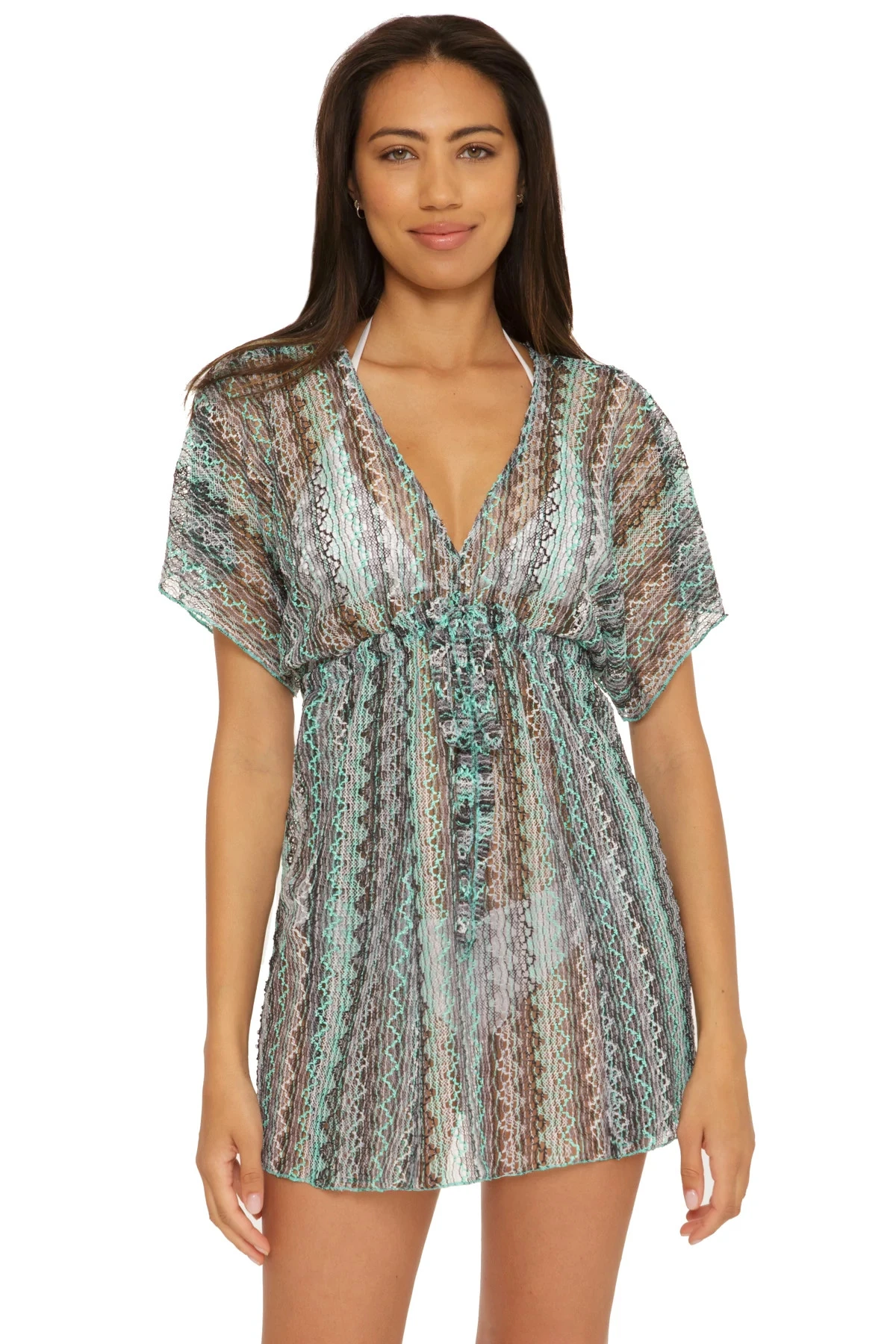 Seine tunic features a crochet knit fabrication with a deep v-neckline and flutter sleeves. Offers an adjustable drawstring waist.