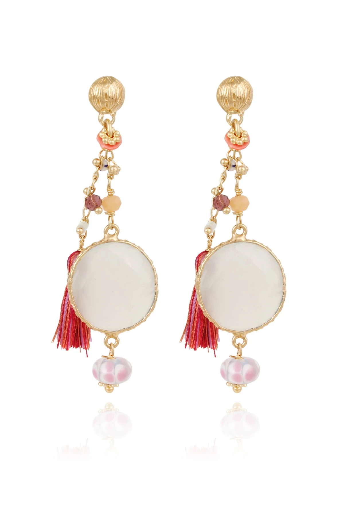 Earrings feature a gemstone pendant with tassel and bead accents hanging from a textured gold bead ear post.