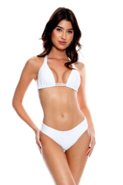 Sliding triangle halter top features a texturized fabric and offers thick, adjustable ties at neck and back for support.