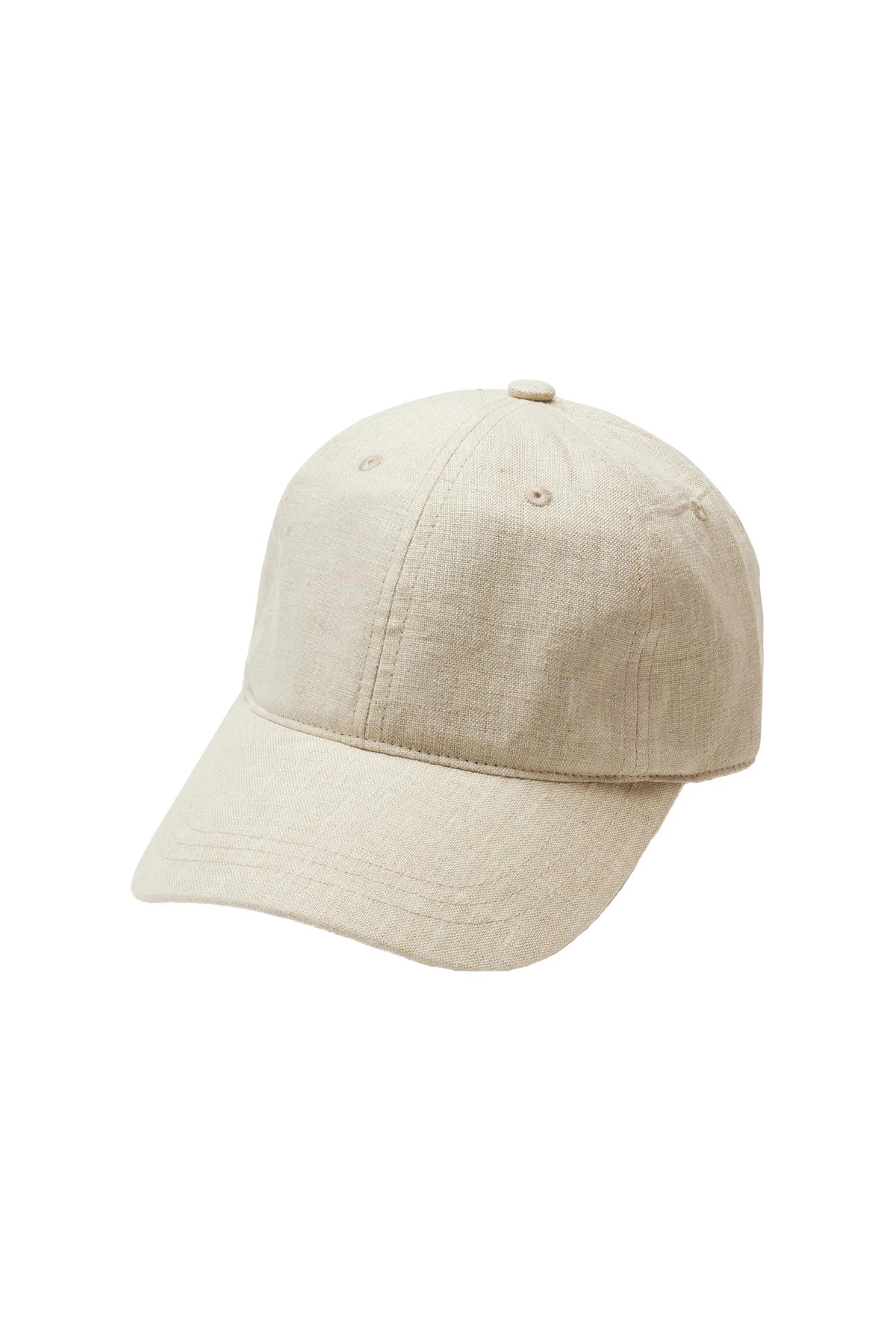 Spencer baseball cap features a linen fabric with a rounded crown and an adjustable band.