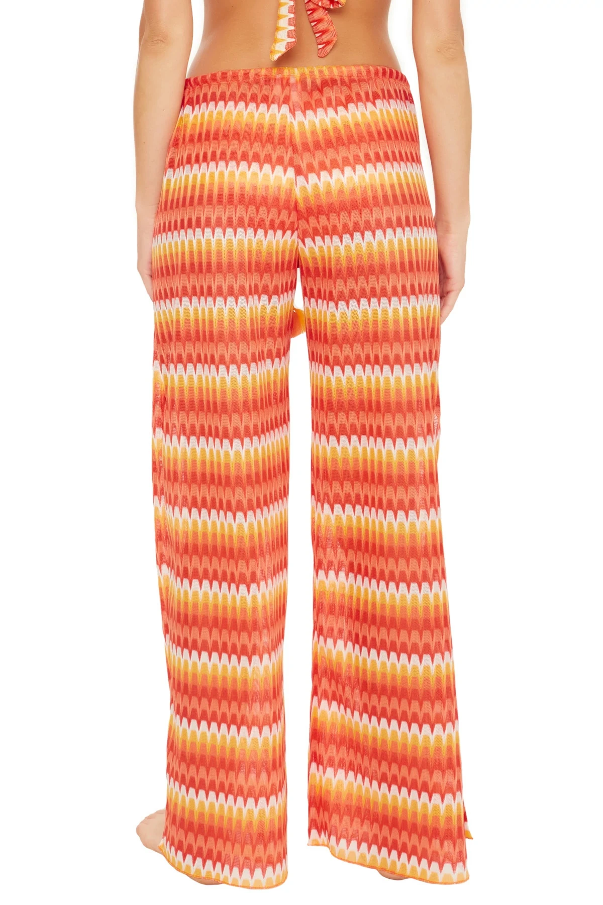 Sunray crochet pant features side slits and offers drawstring tassel ties at waist.