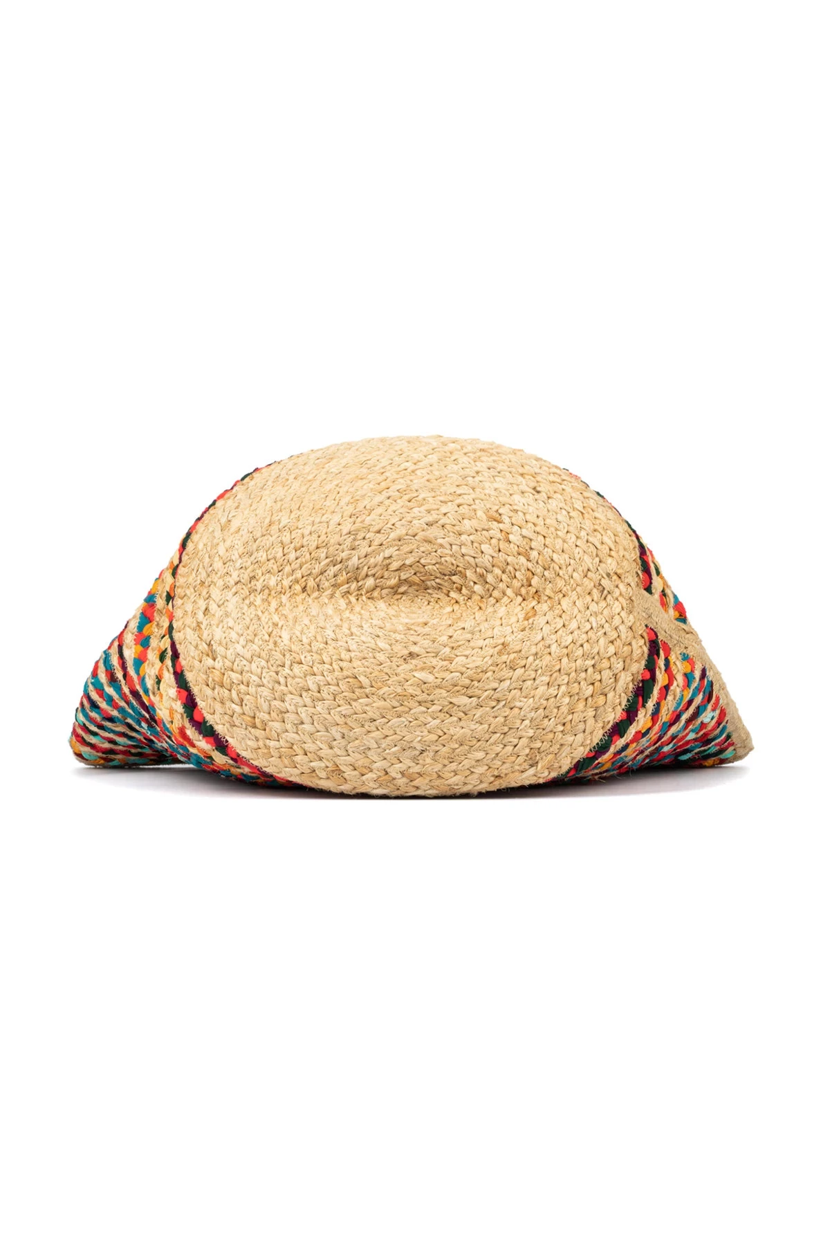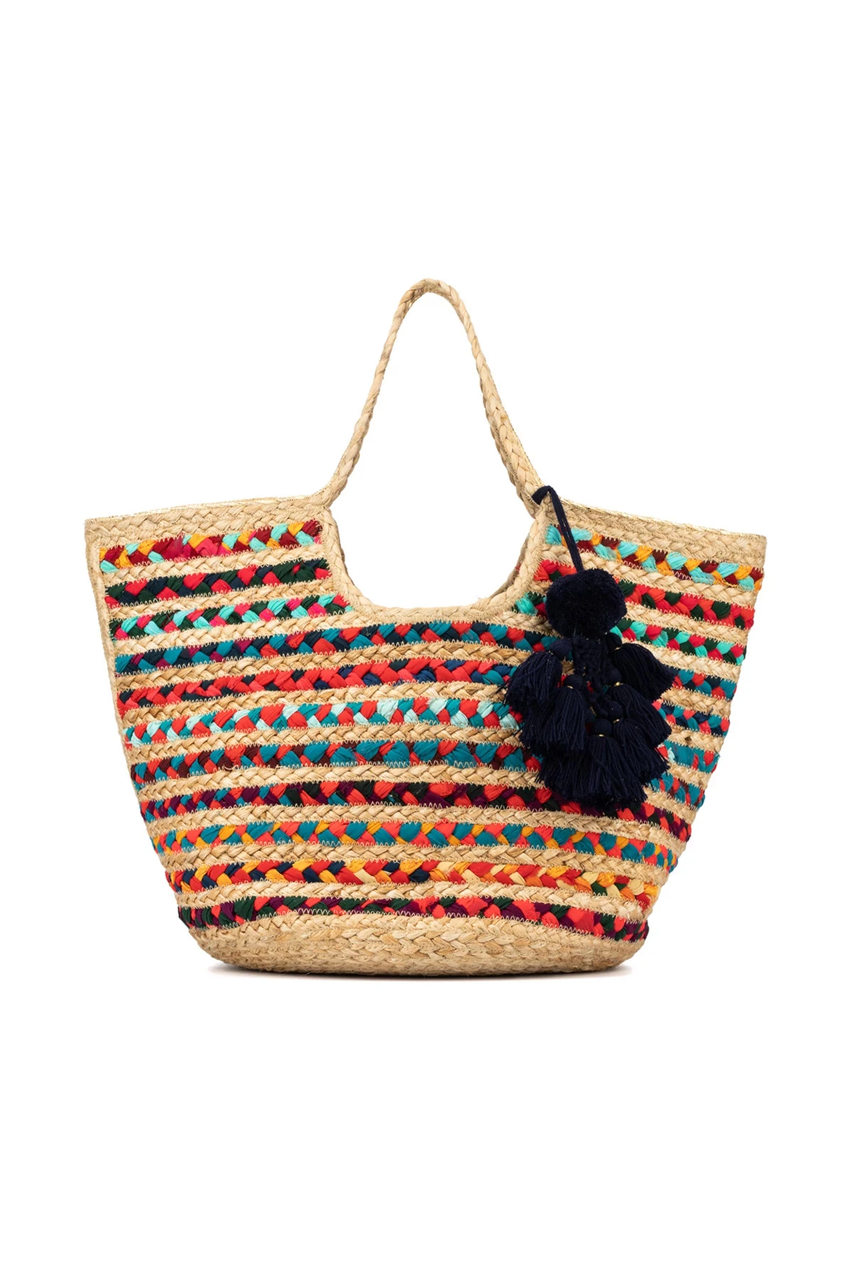 Tote features multi-colored woven raffia with double top handles accented with a large tassel detail.