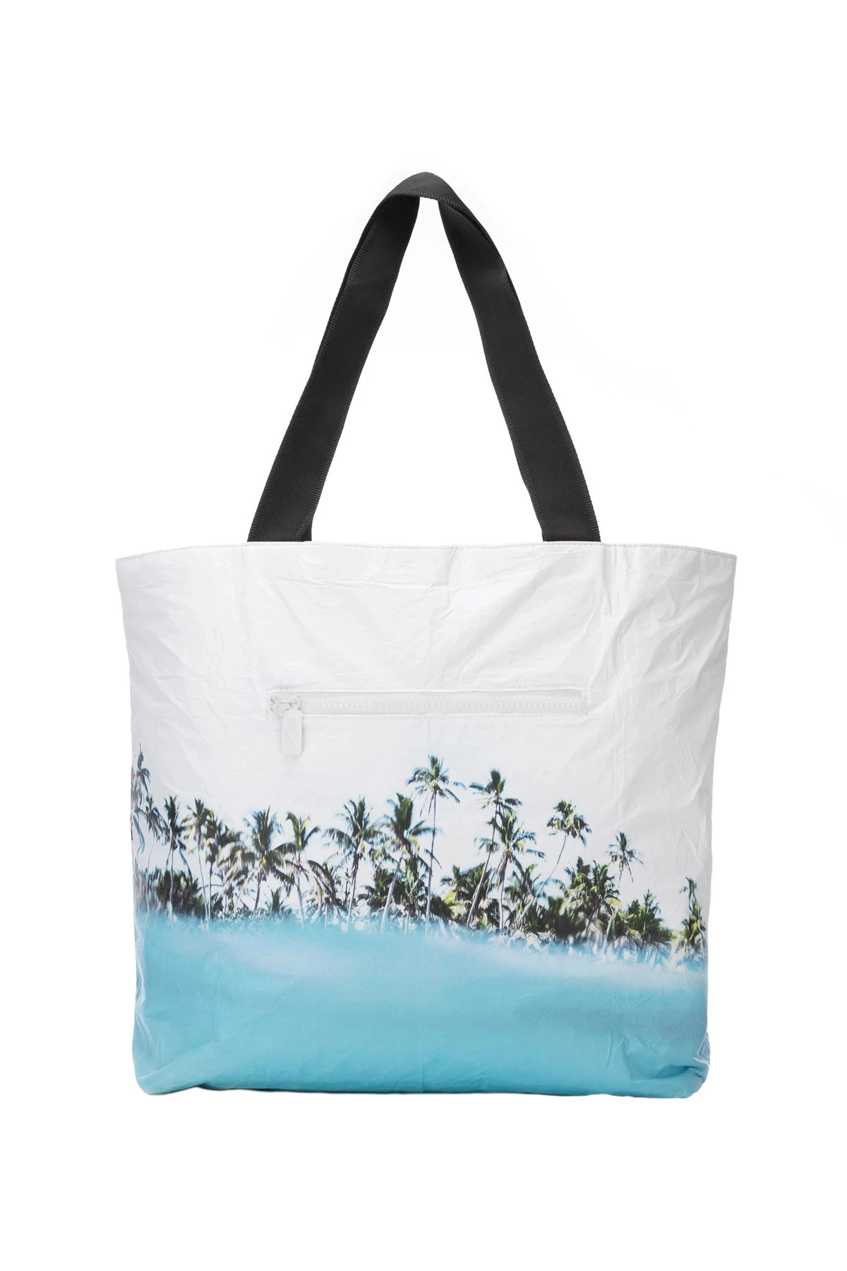 Temae tote bag features a tropical print with a zipper closure and zipper pockets.