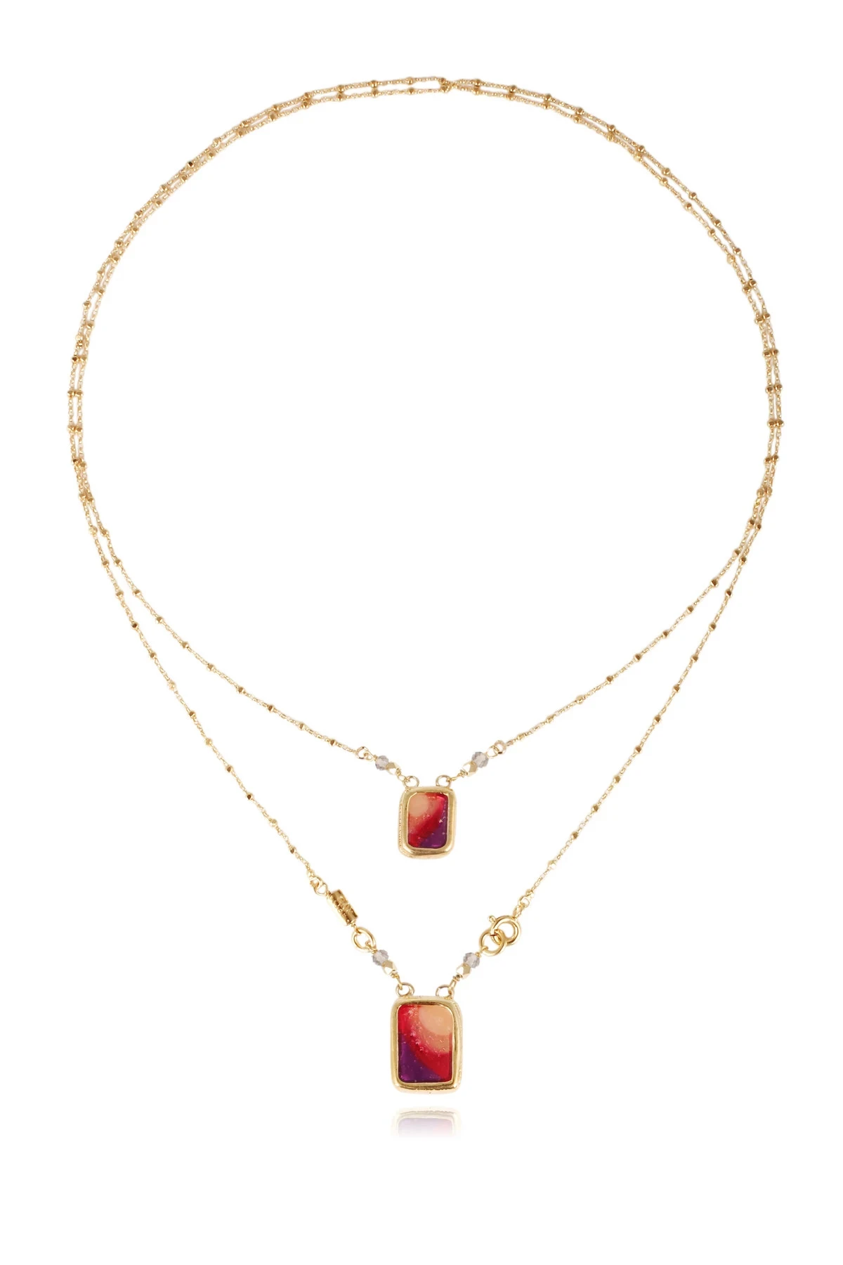 Totem scapulaire necklace is composed of a dainty beaded chain adorned with two hand enameled medallions.