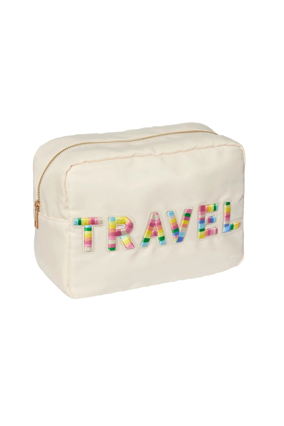 Pouch features a colorful ‘TRAVEL” graphic and offers a zip closure.