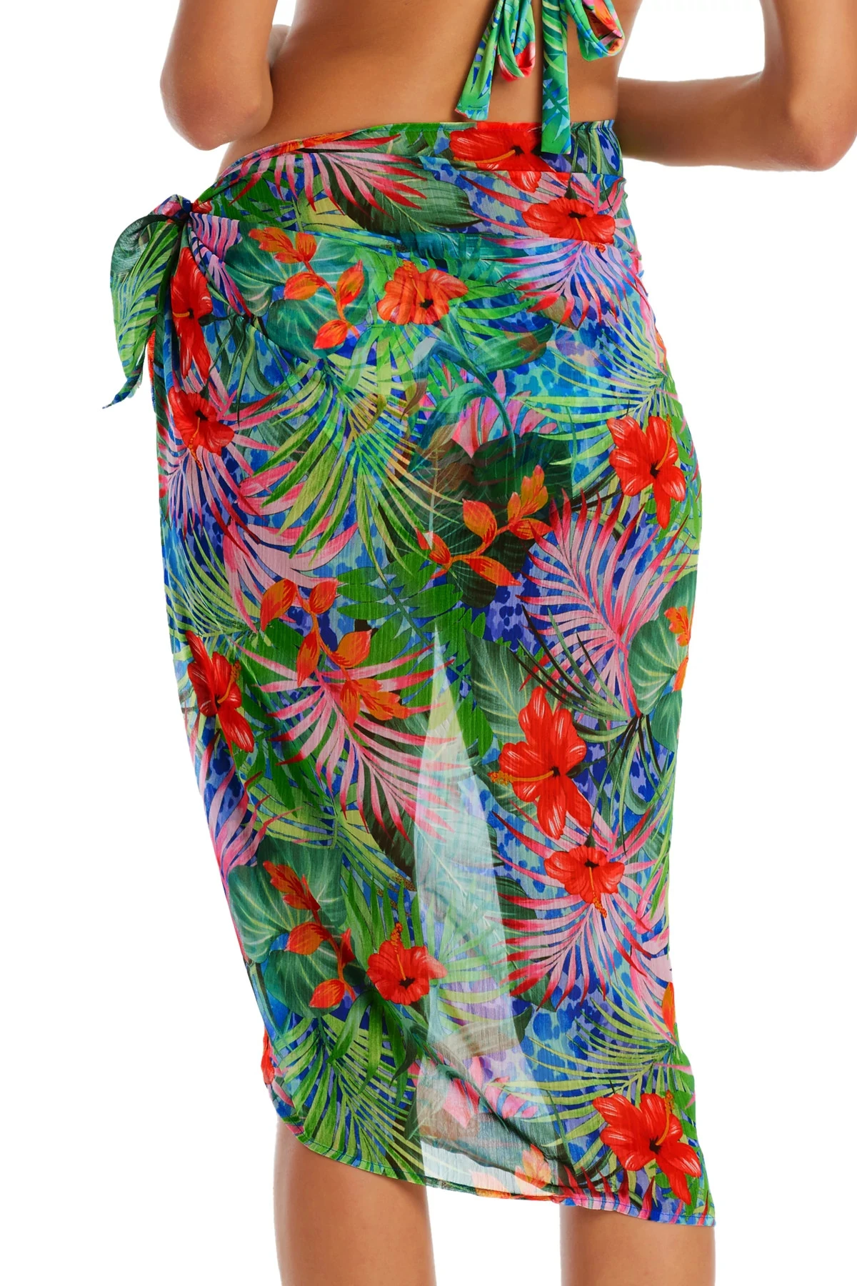 Tropical Flight sarong features a vibrant tropical animal print and offers an adjustable side tie.