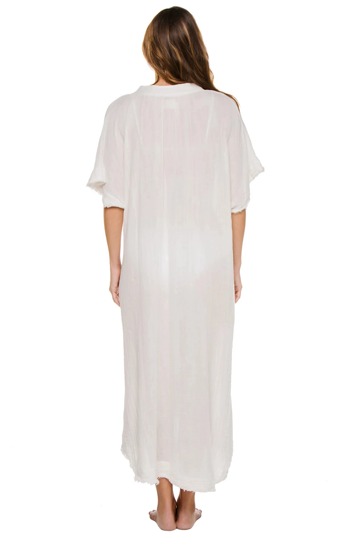 Tunisia short sleeve caftan features on-seam pockets, raw edges and V neckline.